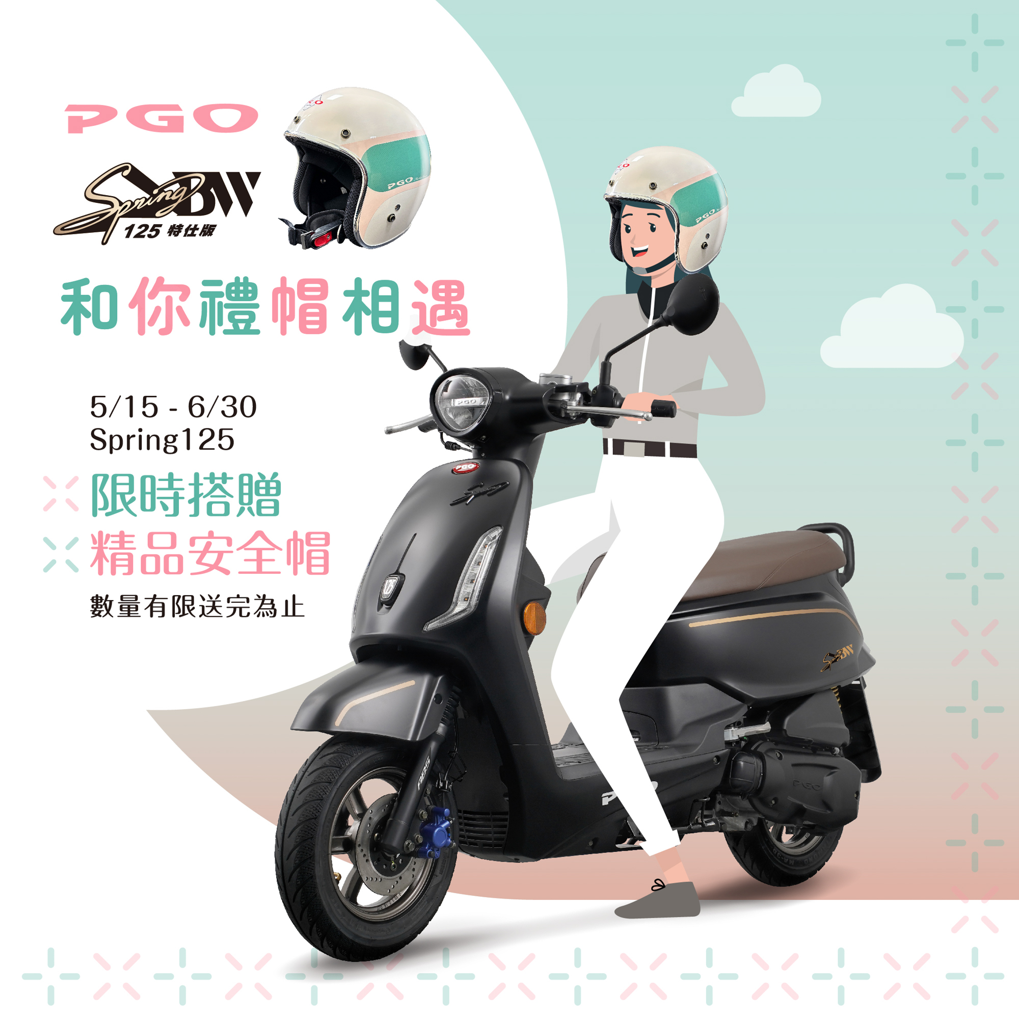 PGO 針對旗下 Spring125 推出購車專屬迎夏限定禮,凡於 05/15-06/30 入主,享有現金/分期同價、36 期分期 0 利率外,在活動期間購買,即贈送專屬 Lady 精品安全帽,限時限量,贈完為止。