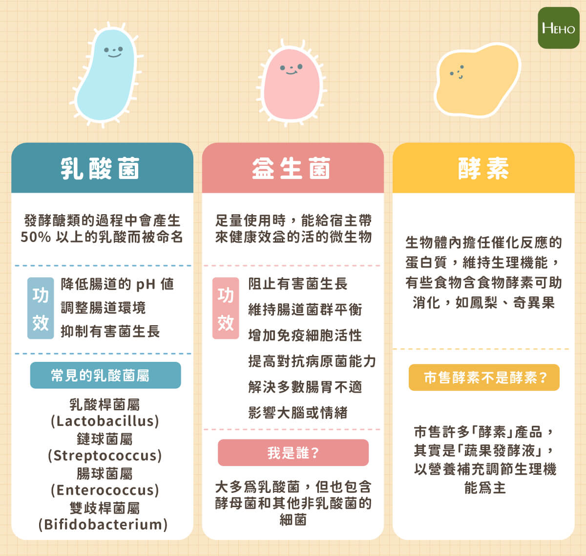 本文授權轉載自《Heho健康》,原文為: 乳酸菌、益生菌、酵素差在哪裡?營養師完整解析 適合補充時機一次看!