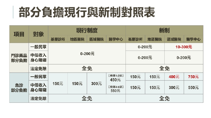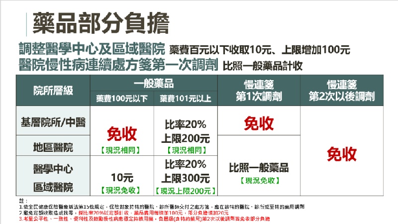 地區醫院及基層診所:維持藥費100元以下免收取藥品部分負擔,101元以上收取20%,最多收200元。醫學中心或區域醫院:藥費100元以下收取藥品部分負擔10元,101元以上收取20%,最多收300元。