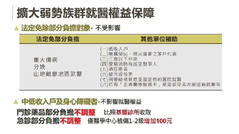 弱勢族群:為減輕中低收入戶、身心障礙者的經濟負擔,不論就醫院所層級,藥品部分負擔均按照基層診所收費方式收取。