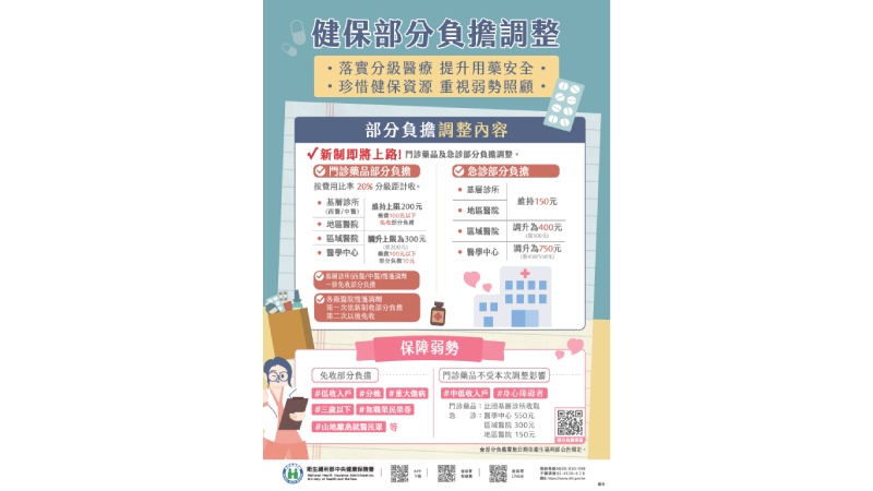 如重大傷病、分娩、山地離島地區就醫,及原本由其他單位補助的低收入戶、榮民、3歲以下兒童、警察消防海巡空勤軍人、油症患者、替代役役男等對象,不受影響;另為保障中低收入戶、持身心障礙證明民眾的就醫權益,亦不會受本次方案調整影響。健保署表示,這次部分負擔調整的目的,是為落實分級醫療與珍惜醫療資源,期待民眾就醫分流,緩解大型醫院急診人滿為患的現況;對穩定的慢性病人而言,鼓勵到基層診所就醫,不影響其就醫支出。在預告期間,健保署將持續蒐集各界意見並完備調整方案上路之相關配套措施,希望透過本次部分負擔調整,能引導民眾正確就醫行為,提升用藥安全,珍惜醫療資源,促進醫療服務效率,使健保效益極大化。
