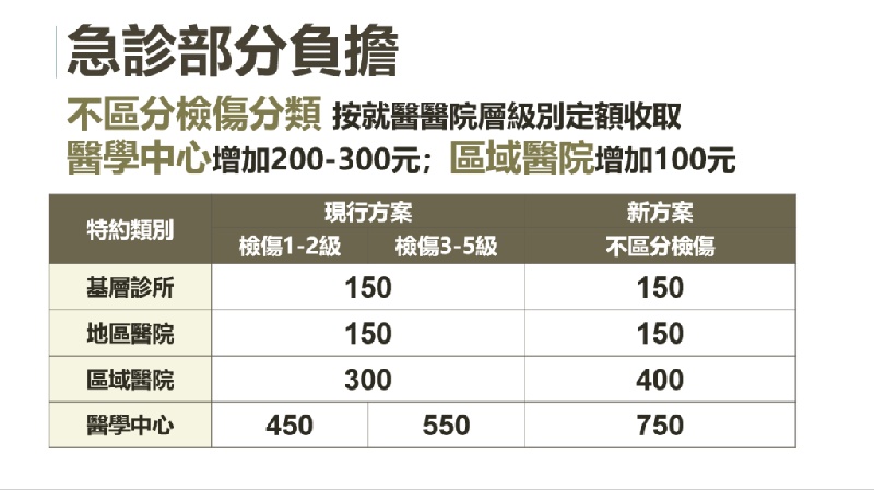 為將大醫院急診資源保留給急重症病人,本次亦調整醫學中心及區域醫院急診部分負擔收費方式,依就醫院所層級別採定額方式收取。醫學中心:調高為750元