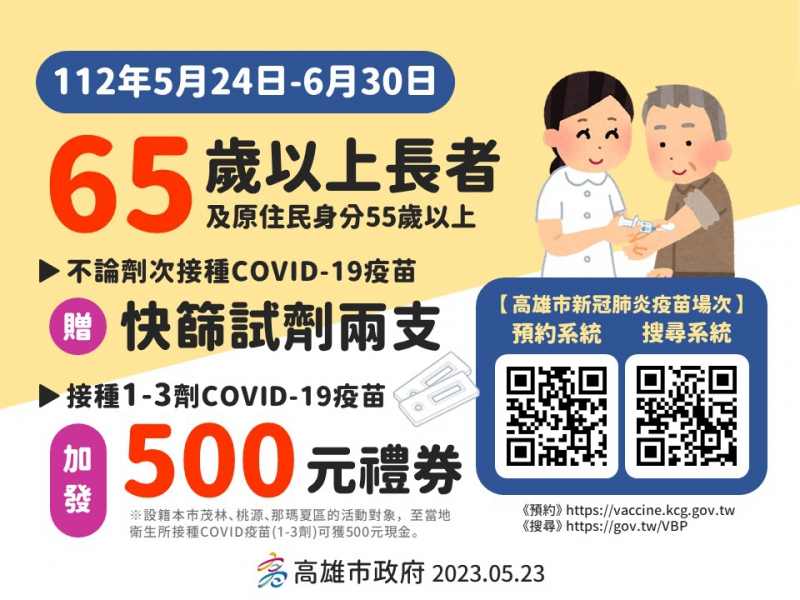 而高雄市衛生局也在同天宣布接種獎勵方案,符合資格者可獲得快篩試劑、500元獎勵禮券,接種獎勵方案如下:- 接種對象:65歲以上民眾及55歲以上原住民