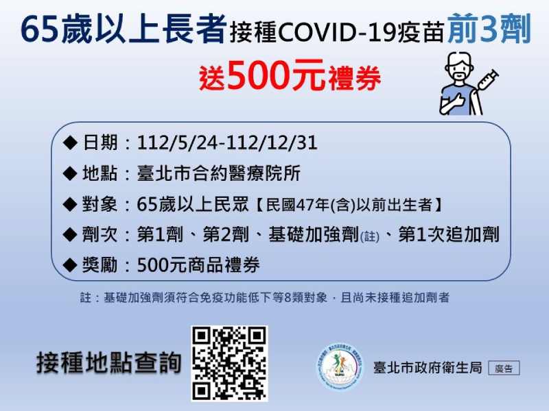 台北市衛生局於5月23日表示,為配合中央COVID-19疫苗獎勵政策,今年5月24日起至12月31日止,凡65歲以上民眾於臺北市合約醫療院所接種COVID-19疫苗前3劑均可獲得500元商品禮券,接種獎勵方案如下: