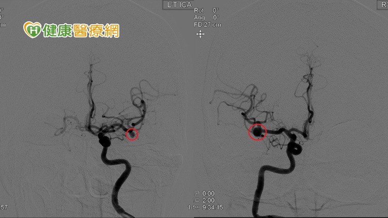 ▲術前血管攝影顯示,陳女士出現左側0.3與右側0.5公分中大腦鏡像動脈瘤。