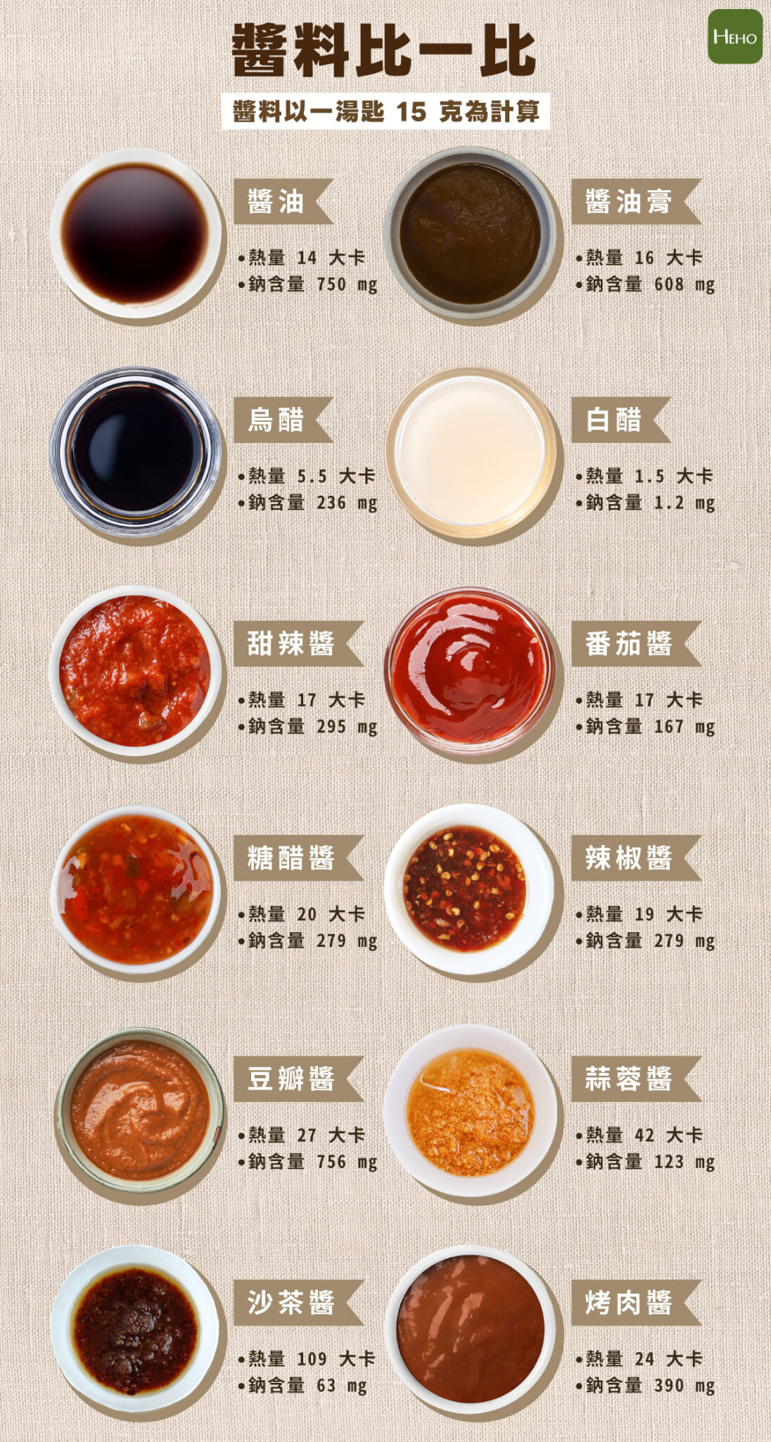 吃水餃不沾醬彷彿少了一味,火鍋一定要特調一碗醬才過癮,從夜市小吃到節慶吃粽子,食材有了對味的醬料,堪稱絕配!醬料的美味無人能敵,然而小小一匙的熱量、鈉含量卻相當可觀。