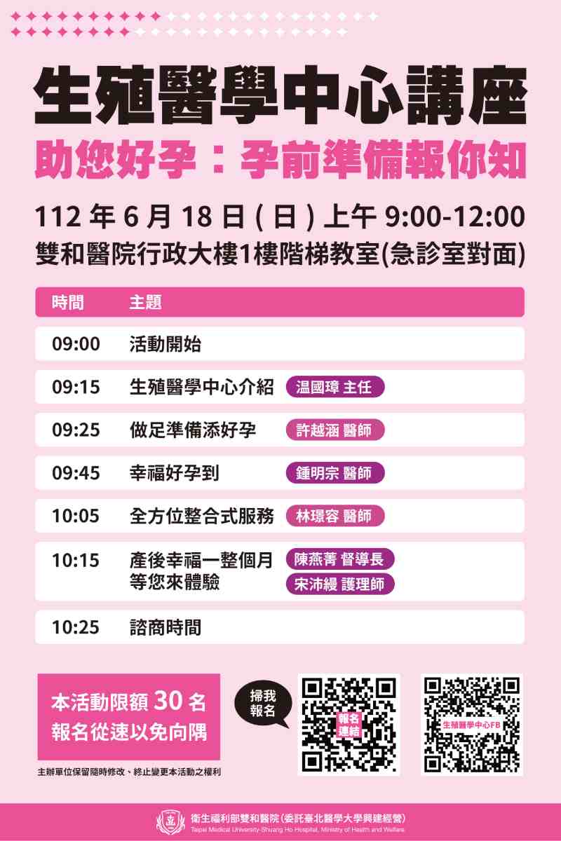 為提升民眾對不孕症與生殖醫學的認識,雙和醫院將在6月18日週日上午,於雙和醫院行政大樓一樓階梯教室舉辦「生殖中心助您好孕講座」,邀請婦產科主任温國璋醫師,以及生殖醫學中心負責人許越涵醫師、鍾明宗醫師及林璟容醫師分享不孕症與人工生殖醫療相關衛教知識。次講座採預約制,活動詳情請參考報名連結(https://www.surveycake.com/s/XlzD9)或雙和醫院官網及官方臉書粉絲團。