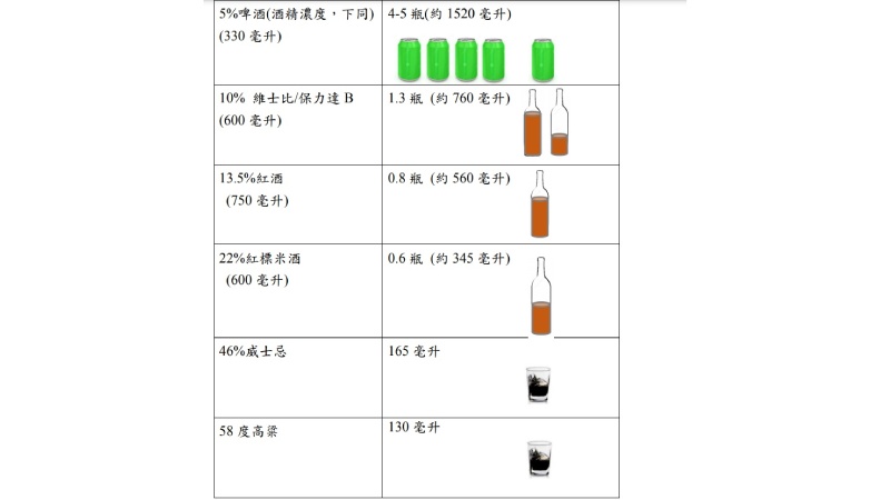 純酒精量(公克)=容器容量(毫升)×數量(杯、瓶、罐等)×對應酒精濃度(%)×0.79(酒精密度)[i]。
