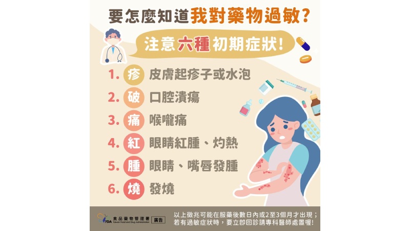 此外也要對「疹、破、痛、紅、腫、燒」6大藥物過敏初期症狀有所了解與警覺,以避免發生嚴重藥物過敏的情況。