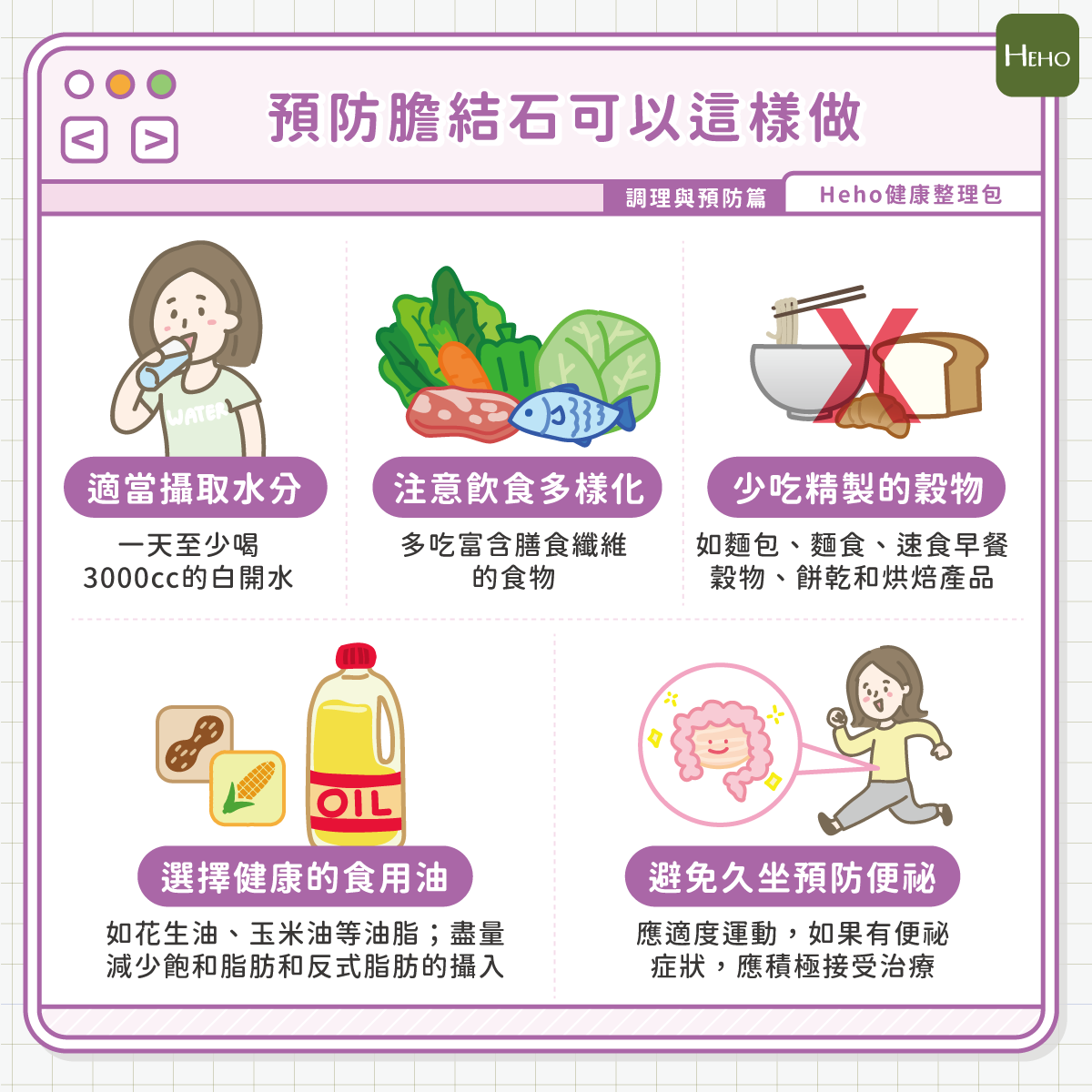 預防膽結石的發生其實不難,只要在平日飲食上遵循以下重點,多能避免膽結石的生成: