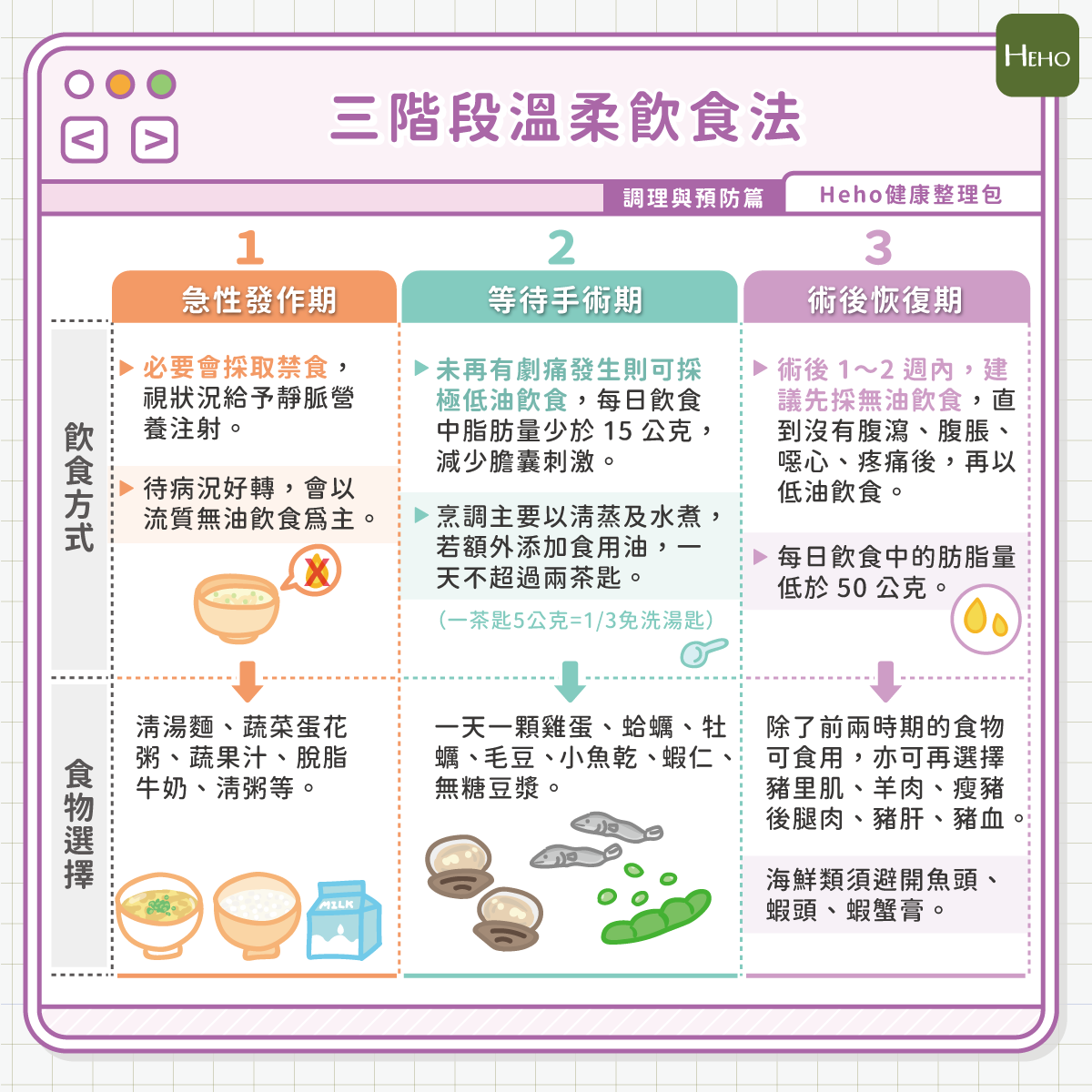 因此,以「只要理解大原則,採漸進式溫柔飲食法」,不僅照顧者容易準備,病患復原速度也會加快。依據急性發作期、等待手術期和術後恢復期三個不同階段,分別採用適當的飲食方式。如果你是有家族遺傳病史者或是已經患有膽囊炎的人,飲食上也建議採用「低油飲食法」做食療控制。