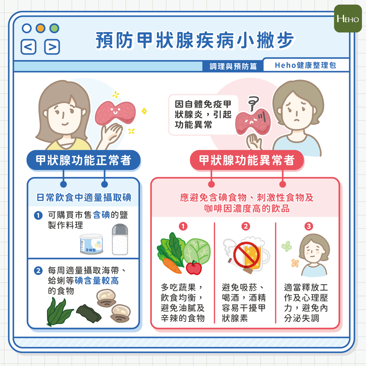 但若已有自體免疫甲狀腺炎引起功能異常者,反而應避免含碘食物、刺激性食物,特別是咖啡因濃度高的濃茶、咖啡等,以避免手抖、心悸的症狀惡化。且應避免抽煙、喝酒,養成規律運動的習慣,並適當紓緩壓力,可練習正念呼吸法,來平衡情緒起伏。