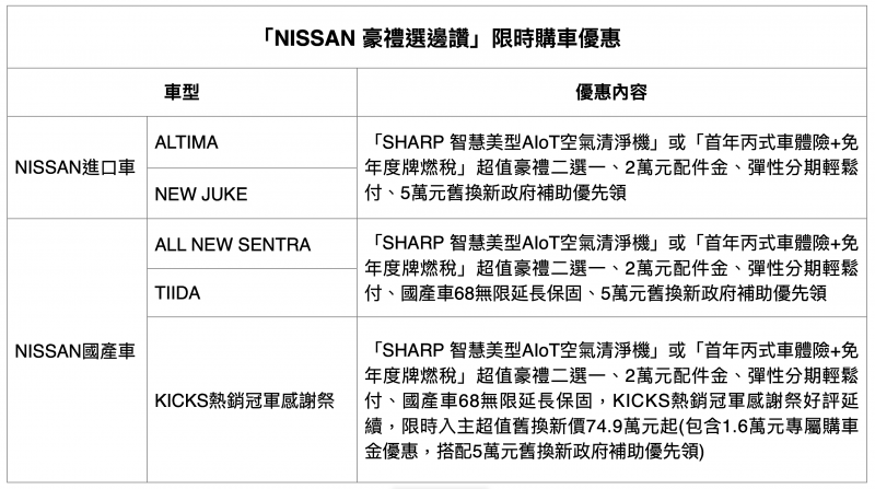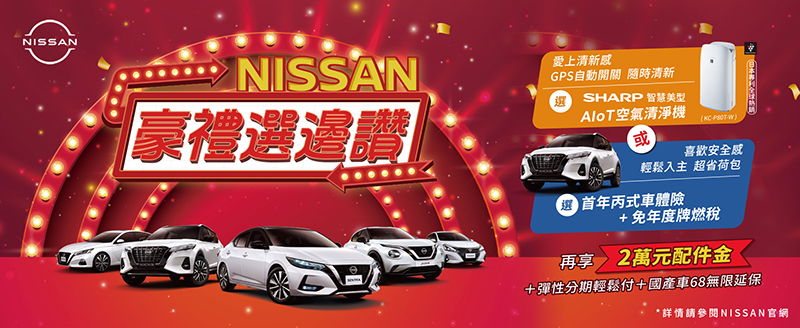 「SHARP 智慧美型AIoT空氣清淨機」超值豪禮,榮獲英國過敏協會認證,PM2.5、細菌濾除率達99.9%,並搭載雲端智慧管家,自動分析提供最佳運轉狀態,同時具備GPS遠端自動開關功能;水活力功能更特別針對台灣夏季氣候,消費者久處冷氣房可能造成肌膚乾燥之情形設計,讓使用者隨時享有自在清新好空氣;「首年丙式車體險+免年度牌燃稅」超值豪禮,「首年丙式車體險」讓民眾開車上路更有保障,「免年度牌燃稅」減輕車主購車負擔,於活動期間內自領牌日起至2023年底之牌照稅、燃料稅NISSAN幫你付,讓民眾購車、開車更有安心感,也為荷包省下大筆花費。「NISSAN 豪禮選邊讚」購車優惠符合消費者不同購車需求,讓民眾輕鬆享受NISSAN優質車款獨特魅力。