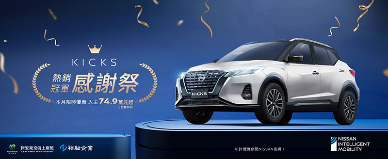 為感謝消費者對NISSAN KICKS的熱愛與肯定,自5月推出NISSAN KICKS熱銷冠軍感謝祭,為持續體貼消費者,優惠好評再延續,自即日起至6月30日止,入主NISSAN KICKS可享超值舊換新價74.9萬元起,包含1.6萬元專屬購車金優惠,搭配5萬元舊換新政府補助優先領方案,讓消費者同步享受優惠價格及全新升級產品魅力。
