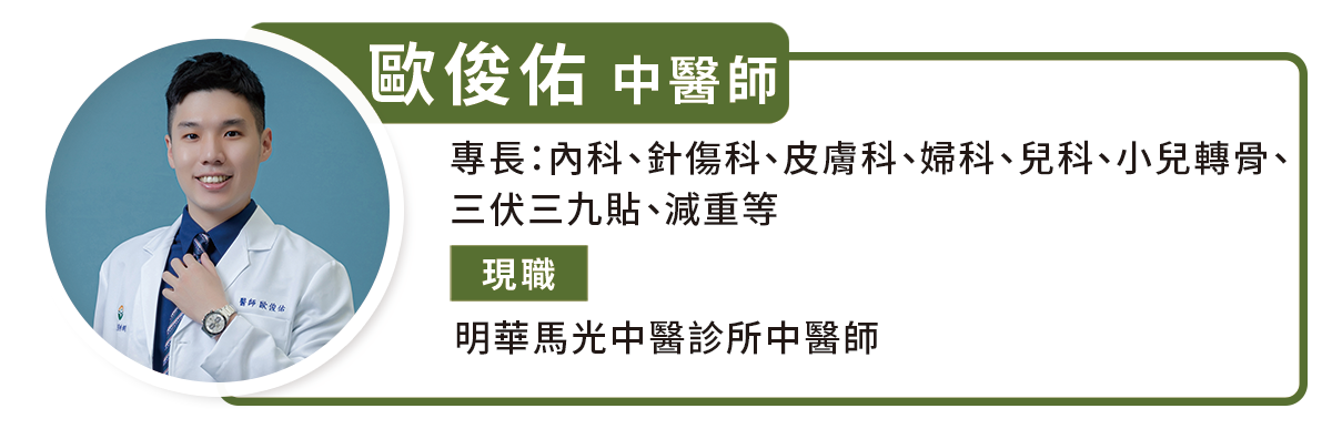 歐俊佑提到,中醫稱濕疹為「四彎風」、「旋耳風」、「浸淫瘡」、「繡球風」、「臍瘡」等,可能經由風邪、濕邪、熱邪或脾虛、血虛引起。台灣地處亞熱帶,夏季濕熱夾雜情況明顯,引起濕疹為濕邪、熱邪為大宗。