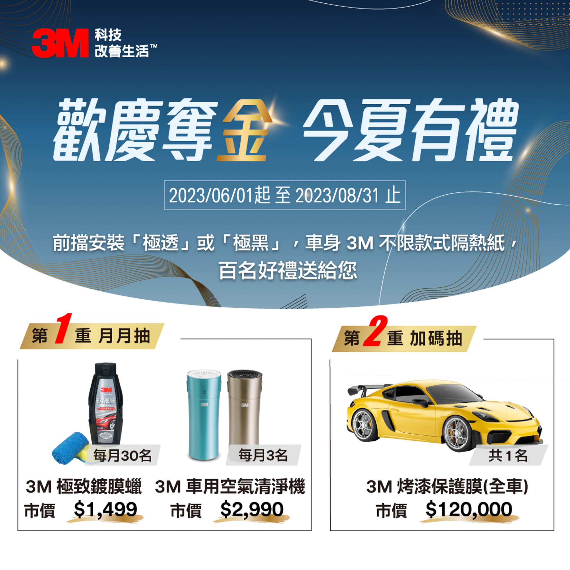 即日起至2023/8/31止,凡於前擋安裝極透/極黑系列隔熱紙產品、並於車身(側窗+後擋)安裝3M不限款式隔熱紙,並完成線上登錄保固者,即可享有抽獎資格。本活動將於每月抽出幸運得主獲3M極致鍍膜蠟套組 (市價1499元)、3M個人隨身型空氣清淨機(市價2,990元) 等好禮;並於活動最後抽出一名幸運兒可獲得3M全車烤漆保護膜高光100 (市價12萬元)。3M歡慶奪金,總共將提供高達100個名額的中獎機會,獎項非常豐富!享受好產品再抽優質好禮,把握機會讓愛車再升級就趁今夏!