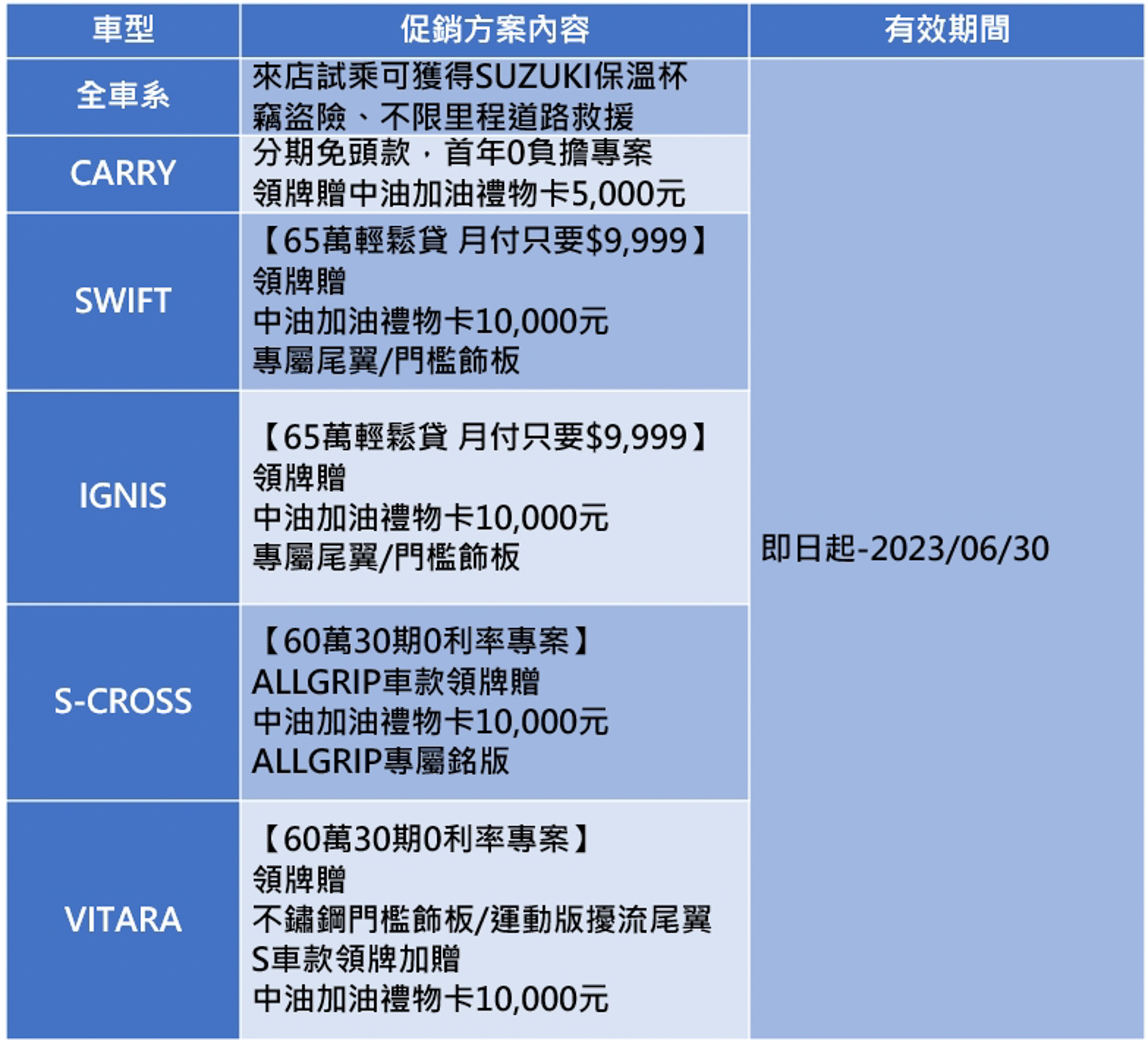 歐洲原裝進口油電 SUV-VITARA 及 S-CROSS 車系,本月可享 60 萬 30 期 0 利率,限定 VITARA S 車款及 S-CROSS ALLGRIP 車款,本月領牌加贈中油加油禮物卡 $10,000 元。