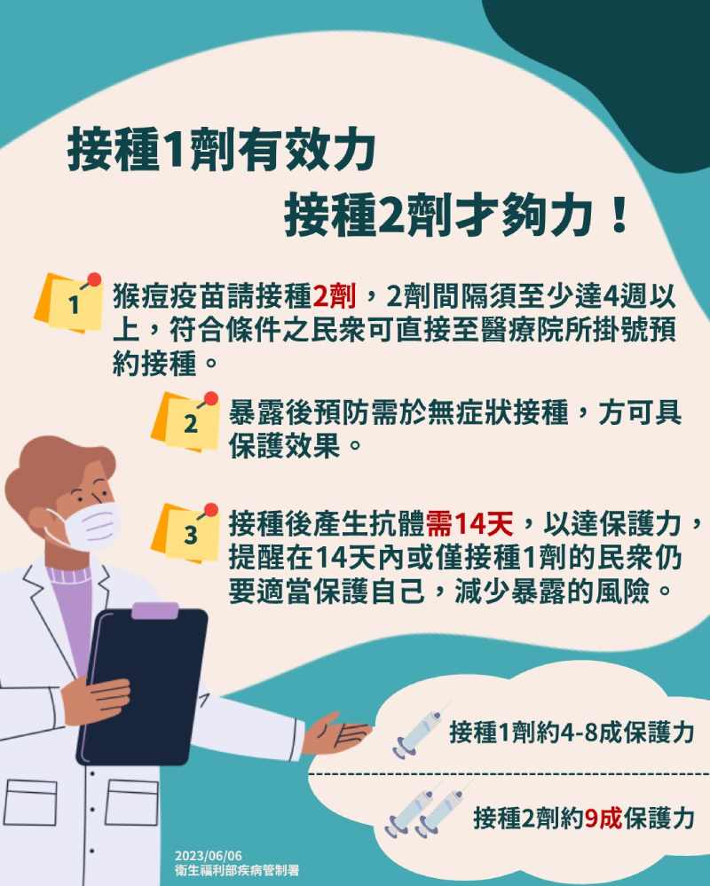 羅一鈞提醒,打1劑猴痘疫苗保護力只有4-8成,如果可以接種到2劑猴痘疫苗,保護力能提升到9成,呼籲民眾盡速接種。