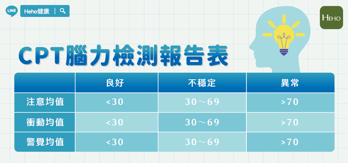 專注力測驗 CPT 主要用於評估短期與長期注意力缺陷,以及衝動失控等腦力狀況,透過 15 分鐘測驗將受測者的注意力、衝動值、持久性專注力及警戒性等各方面評估「指數化」得出 13 個數值,再將各數值交叉比對。