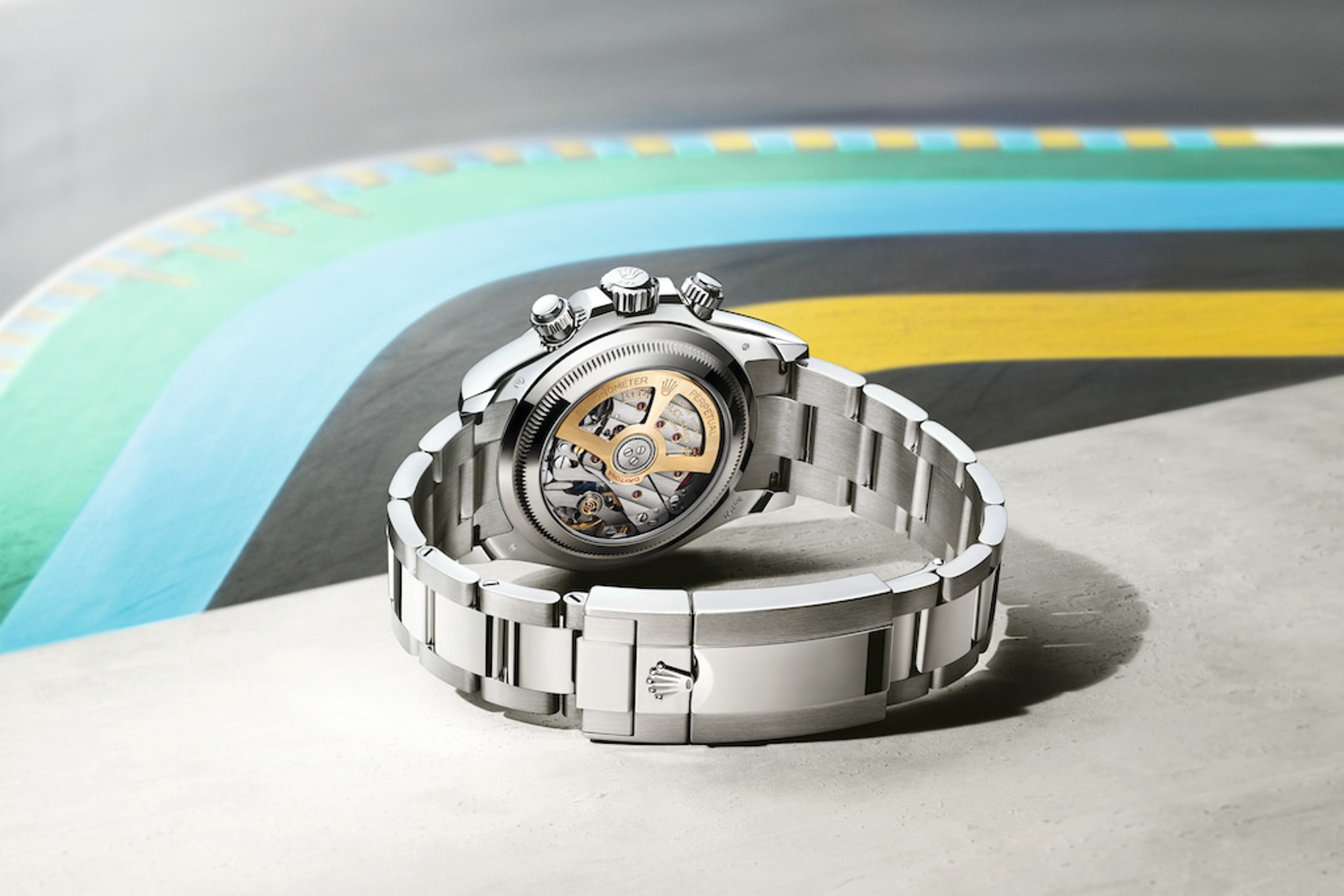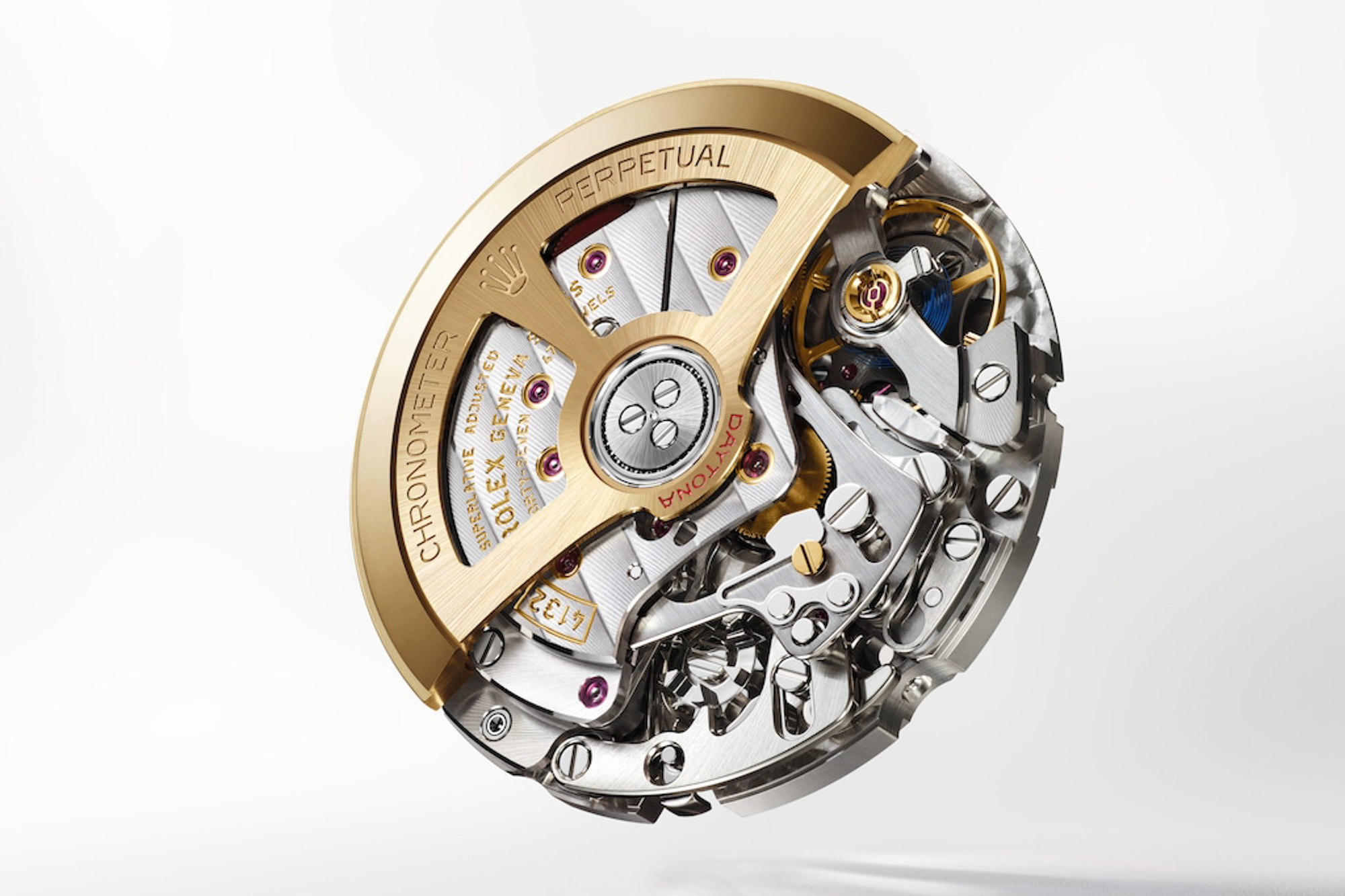 此別具匠心的腕錶搭載 4132 型機芯。該機芯改良 自 4131 型機芯,突破傳統的 12 小時計時機制, 可連續計時長達24小時。4132型機芯配置Chronergy 擒縱系統與 Paraflex 緩震裝置,並採用新穎飾面與裝飾,如夾板上綴飾的勞力士日內瓦波紋,重新演繹經典製錶飾面。18K 黃金鏤空自動陀配以改良滾珠軸承。一如所有勞力士腕錶,此特別款 Oyster Perpetual Cosmograph Daytona 獲頂級天文台精密時計認證, 確保腕錶於佩戴時能發揮超卓性能。