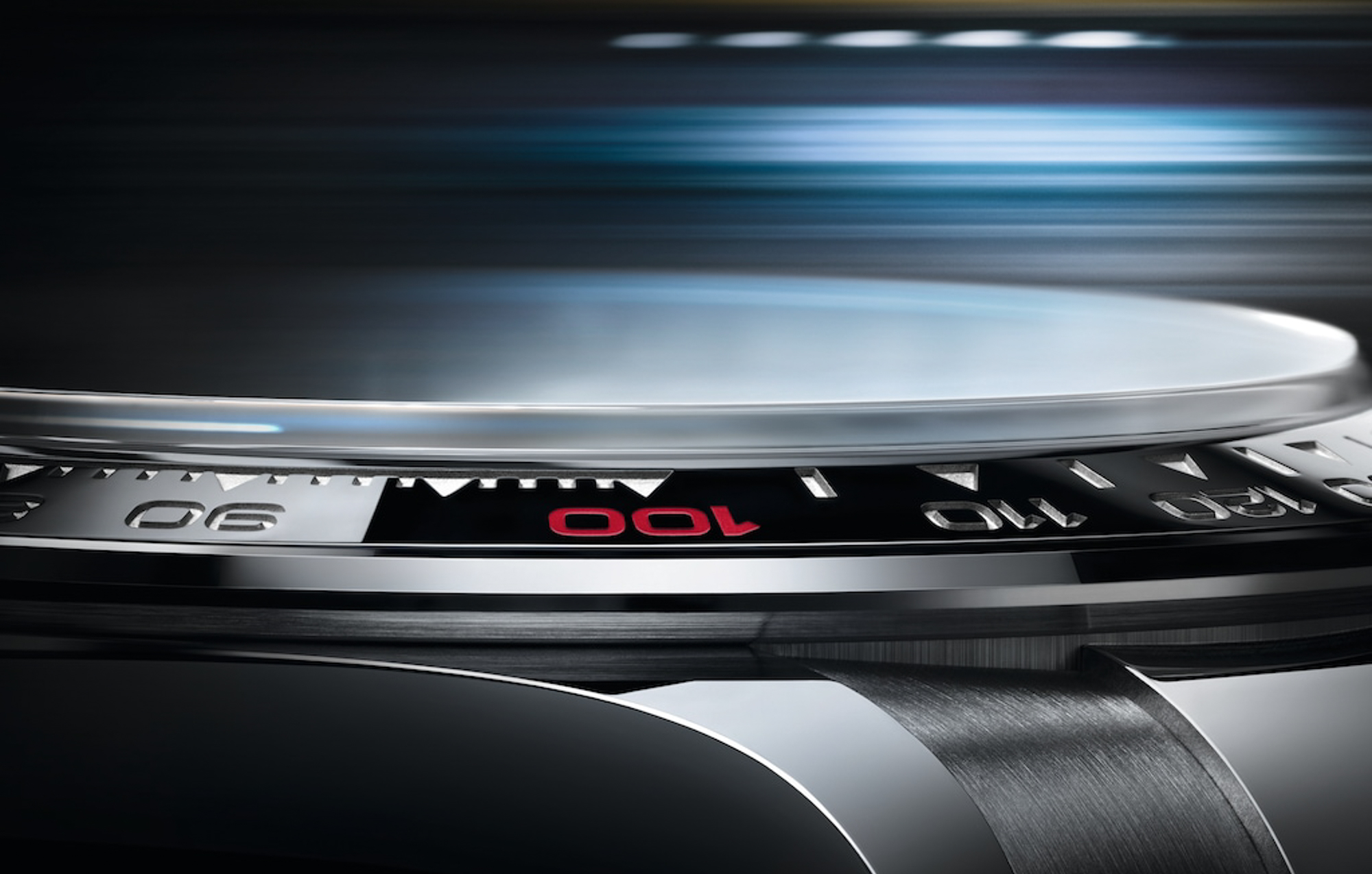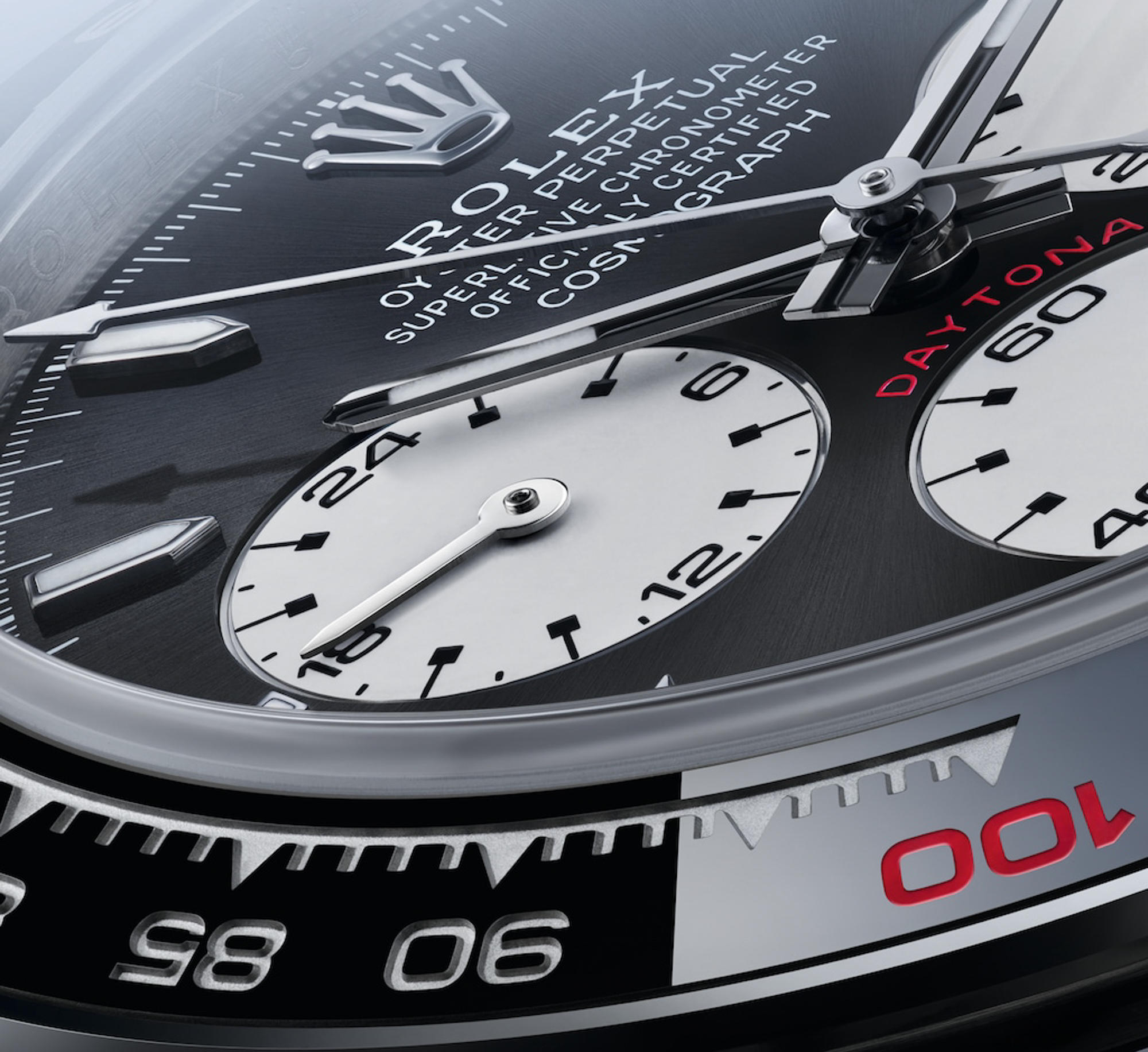 新款 Cosmograph Daytona 腕錶配備黑色 Cerachrom 陶質外圈。 除紅色標注的數字 100 之外,測速計上的模鑄刻度與數字以 PVD (Physical Vapour Deposition,物理氣相沉積工藝)鍍膜技術鍍上一層薄薄的鉑金。