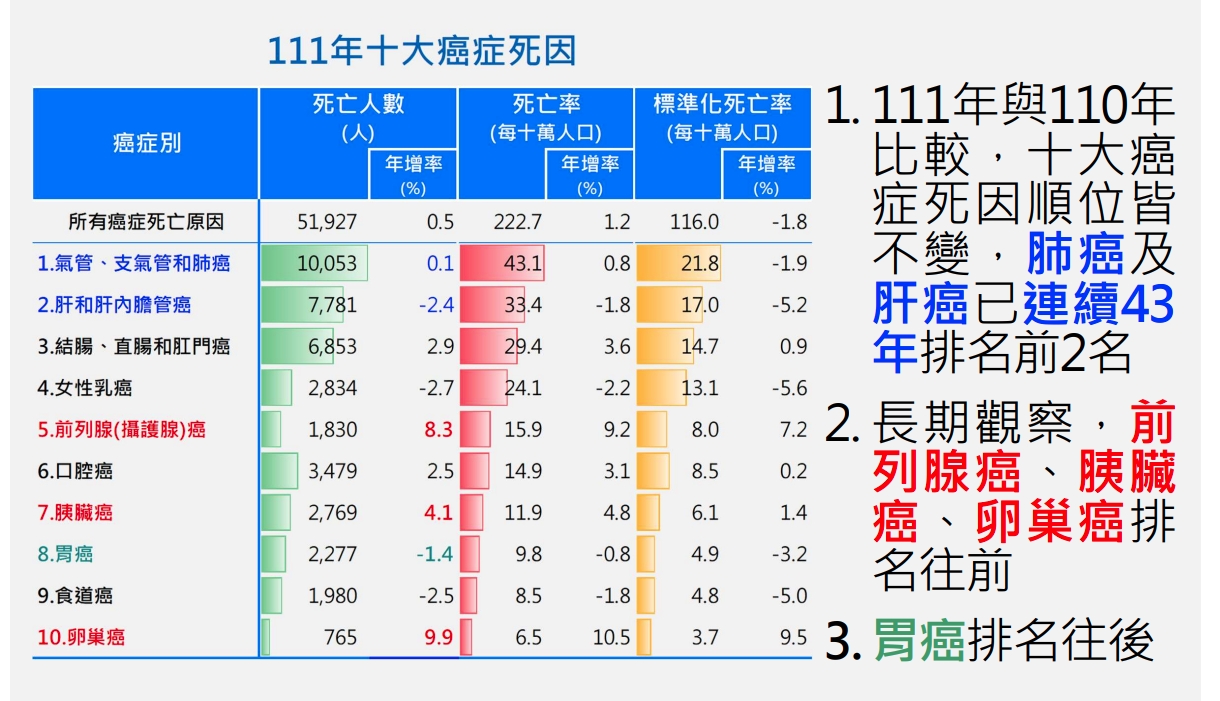 十大癌症死亡率第一大死因仍為肺癌,其餘排名順位跟去年相同。依序為「肝和肝內膽管癌」、「結腸、直腸和肛門癌」、「女性乳癌」、「前列腺(攝護腺)癌」、「口腔癌」、「胰臟癌」、「胃癌」、「食道癌」及「卵巢癌」。
