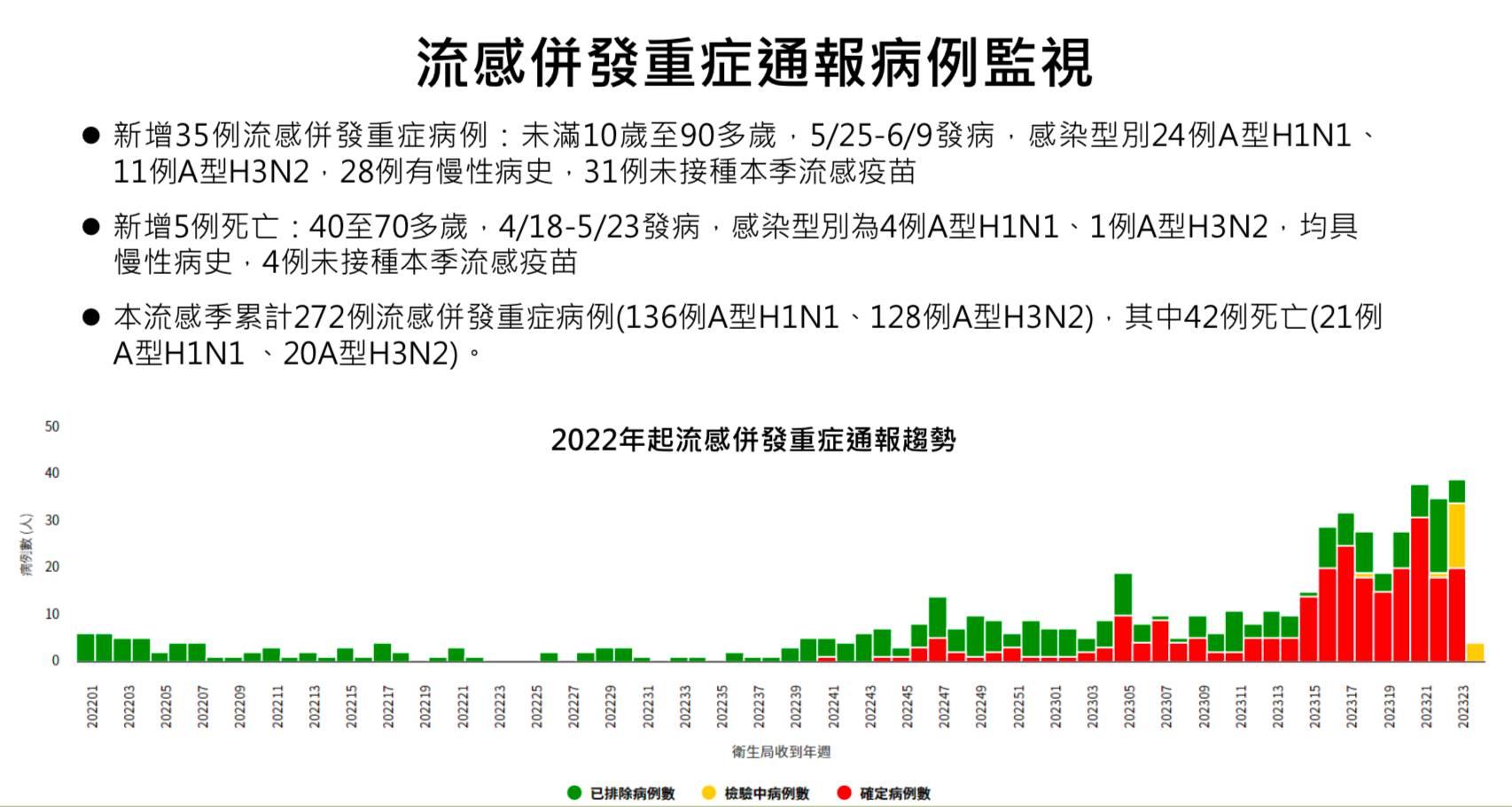 本流感季自去年 10 月 1 日起截至今年 6 月 12 日流感併發重症病例累計 272 例,136 例 A 型 H1N1、128 例 A 型 H3N2、3 例 A 型未分型、5 例 B 型,年齡層以 65 歲以上長者為多占 49% ,88% 未接種本季流感疫苗,80% 具慢性病史,其中死亡 42 例 21 例 A 型 H1N1、20 例 A 型 H3N2、1 例 B 型,81% 未接種本季流感疫苗,93% 具慢性病史。