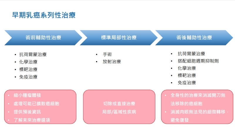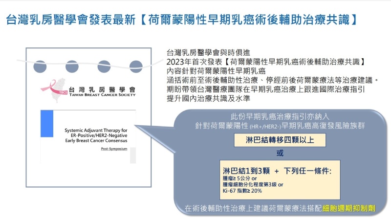 台灣乳房醫學會今年首次發表最新的「荷爾蒙陽性(HR+HER2-)早期乳癌術後輔助治療共識」,針對各癌別涵括術前至術後輔助性治療、停經前後荷爾蒙療法等提供治療建議。陳守棟進一步說明,針對荷爾蒙陽性(HR+HER2-)、且為高復發風險族群的患者,術後輔助性治療建議可選擇荷爾蒙治療搭配細胞週期抑制劑。與醫師討論最適合的治療方式,讓治療目標從延長存活,有機會達到治癒,及早啟動避險治療。