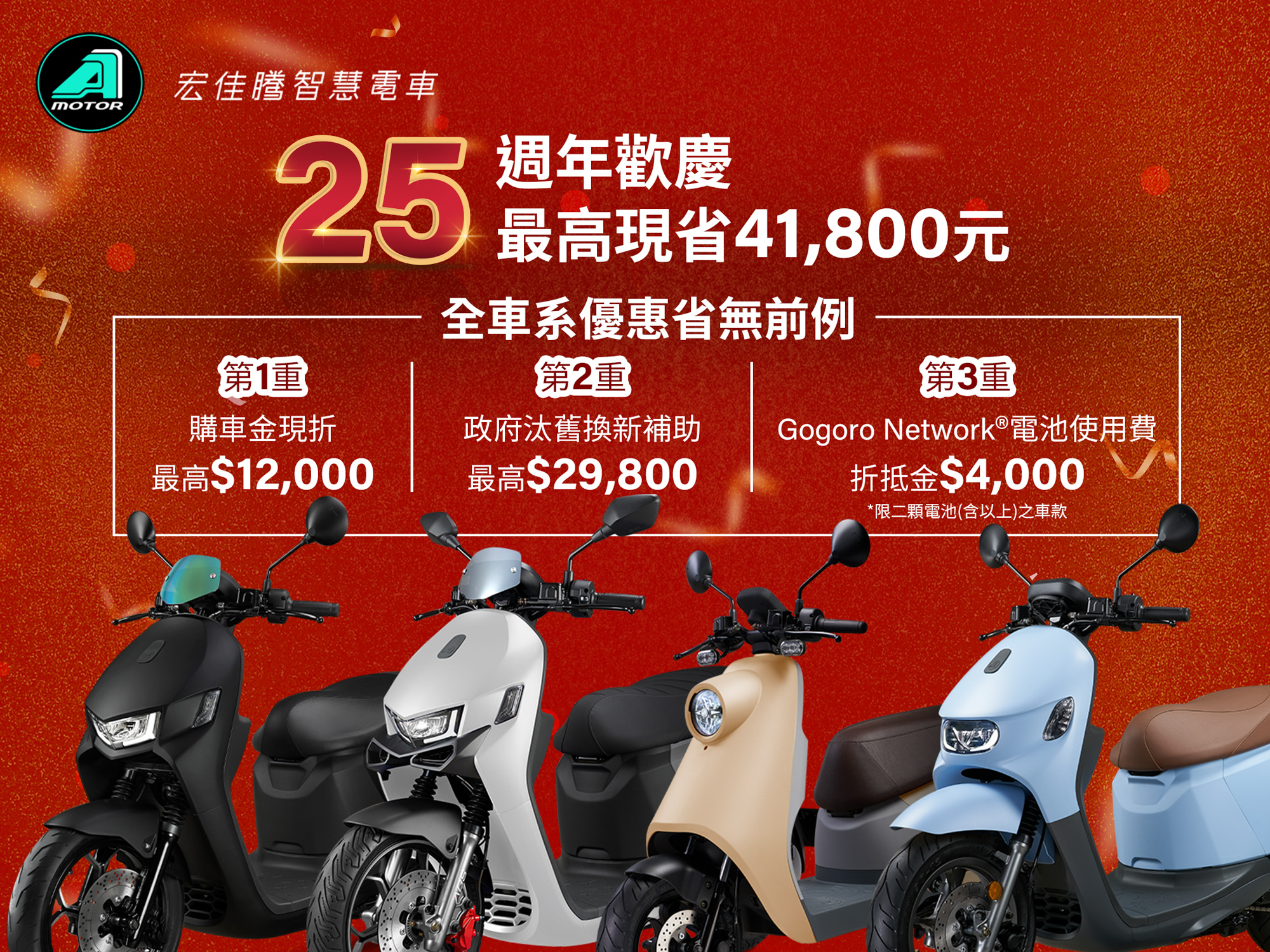 宏佳騰慶祝品牌 25 週年生日,自 6 月 1 日推出史上最大幅度購車優惠活動,現在選購宏佳騰智慧電車 Ai-1 Ultra ABS、Ai-1 Sport、Ai-1 Sport+、Ai-4 Ever 等車款,即可享有高達 12,000 元的折扣優惠,搭配政府汰舊換新補助最高 29,800 元,讓消費者最多省下41,800元。除購車優惠補助外,於活動期間入主宏佳騰智慧電車並選擇搭載二顆或更多電池的「高用量自由省」方案,還能享受 Gogoro Network® 加碼提供的 1,000 元電池使用費折抵金,最高可折抵 4,000 元。新車主還可根據個人需求選擇現有的自由省319元方案,或是全新推出的「自由省 519 元」和「自由省 819 元」方案。
