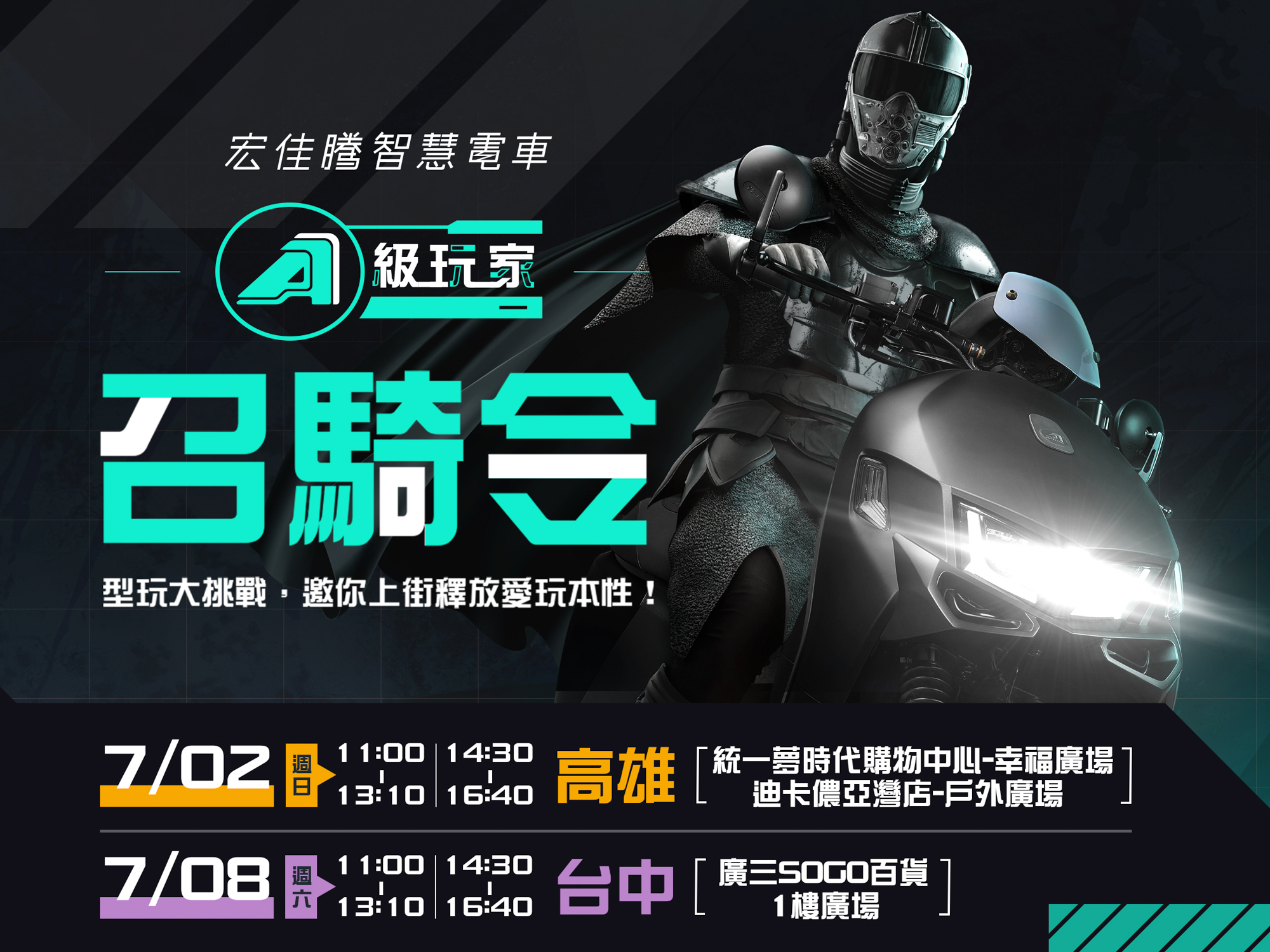 宏佳騰精心打造的「型玩大挑戰」台北首場已於 6 月 10 日圓滿落幕,獲得車友一致好評;而中南部的巡迴挑戰也即將開跑,於7月2日在高雄統一夢時代購物中心幸福廣場和迪卡儂亞灣店的戶外廣場,以及 7 月 8 日於台中廣三 SOGO 百貨一樓廣場舉辦,歡迎各路「A級玩家」們把握最後報名機會,將豐富好禮與 PS5 遊戲機帶回家。