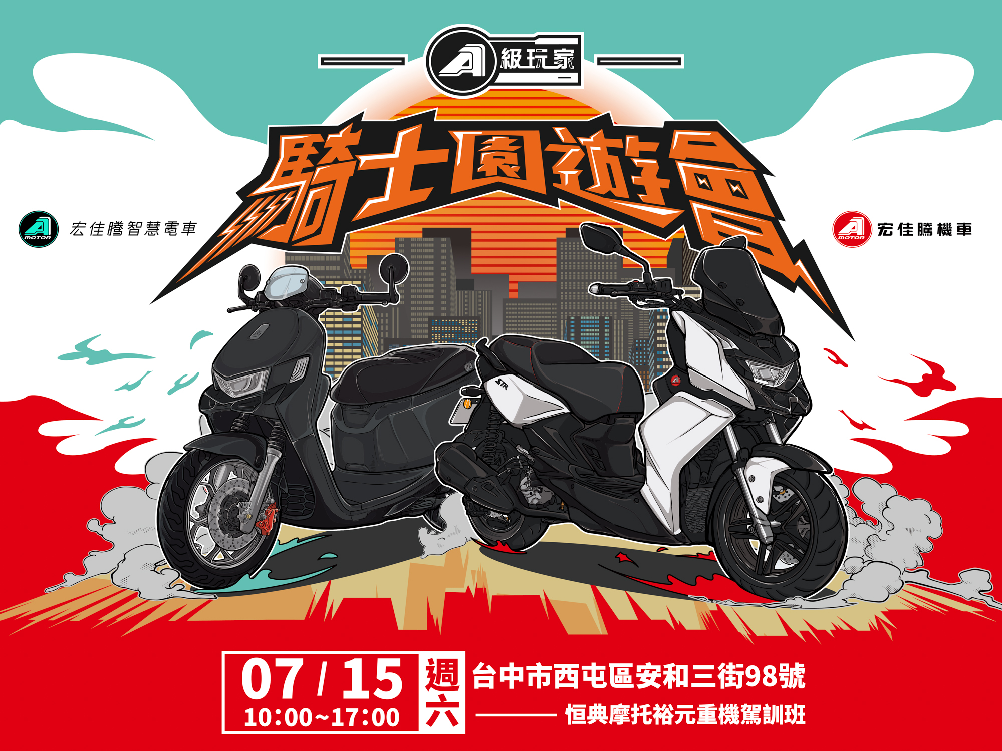 除了「型玩大挑戰」外,也將於 7 月 15 日在台中恒典摩托裕元重機駕訓班舉辦盛大的「A 級玩家-騎士園遊會」活動,號召所有宏佳騰車友及喜歡二輪的消費者共襄盛舉,不限品牌車主皆可免費入園同樂。園遊會邀請知名車界Youtuber-炸彈客黃晧、昆娜 Queena現身互動,並邀請 insta360、先創國際、Red Bull、Ridea、川歐力士煞車部品、apexx、LIQUI MOLY Taiwan - 力魔機油、台灣油力特股份有限公司、KOSO TAIWAN、Speed Evo 極速進化、MAXXIS 瑪吉斯輪胎、極妒 Jealou’S、Frando、SOL Helmets等知名品牌前來展售並提供精美抽獎品,SHOEI、大通、寶麗萊亦會提供的精美抽獎品,只要參加「A 級玩家-騎士園遊會」即可參與闖關遊戲,完成早鳥報名即享首關通關,再於活動當日完成各關卡遊戲,如:拍照打卡、試駕體驗、改裝車投票等項目,就有機會把各知名品牌的好禮帶回家!同時,更特別為喜愛改裝的宏佳騰車友們精心準備一場選美比賽,參加車友有機會把萬元獎金帶回家。此外,所有宏佳騰「A 級玩家」們只要完成報到即有豐富的限量專屬禮。活動現場也將集結各式美食、街頭藝人表演。報名連結:https://ai.aeonmotor.com.tw/pages/AiGardenparty