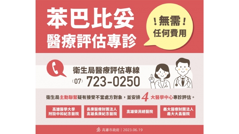 高雄市政府同步啟動護童專案,通知近1個月內在4間診所使用該藥,或近半年內在4間診所使用該藥3次以上的未滿18歲孩童,至高醫、榮總、高長、義大(大昌)四家醫學中心接受免費醫療評估及看診。衛生局也開設專線(07) 723 0250提供市民諮詢服務。