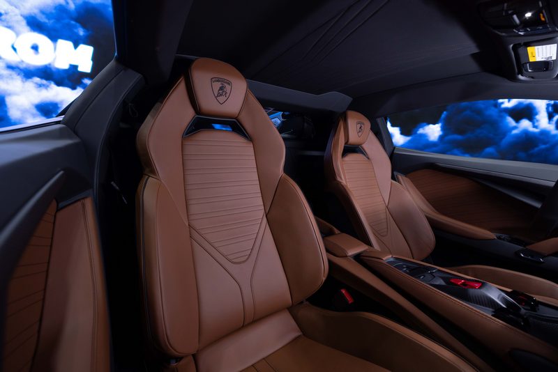 Revuelto之車內設計延續戰鬥機艙的概念。進入車內同時,駕駛即成為主角,彷若化為機器的一部分,主要的控制介面環繞駕駛者,清晰可見且易於操作。Y字型的儀表板設計在駕駛者和乘客間創造無縫隙的銜接。所有駕駛功能皆可輕易地透過方向盤的控制按鈕進行操作,乘客座新增的副駕觸控顯示螢幕不僅增強了內裝設計的運動感,亦使乘客體會到與駕駛同步的熱血駕馭體驗。藉由Revuelto,Lamborghini開啟了全新的沉浸式共享駕駛體驗,駕駛與副駕可以同時在各自座位的顯示幕查看車輛的駕駛動態資訊。並可藉由「Swipe」功能,像智慧手機一般直觀、輕鬆地將應用程式或訊息於中央觸控螢幕及駕駛及副駕顯示螢幕之間移動。全新的多媒體人機介面引用Lamborghini次世代UI設計提供創新佈局與色彩。
