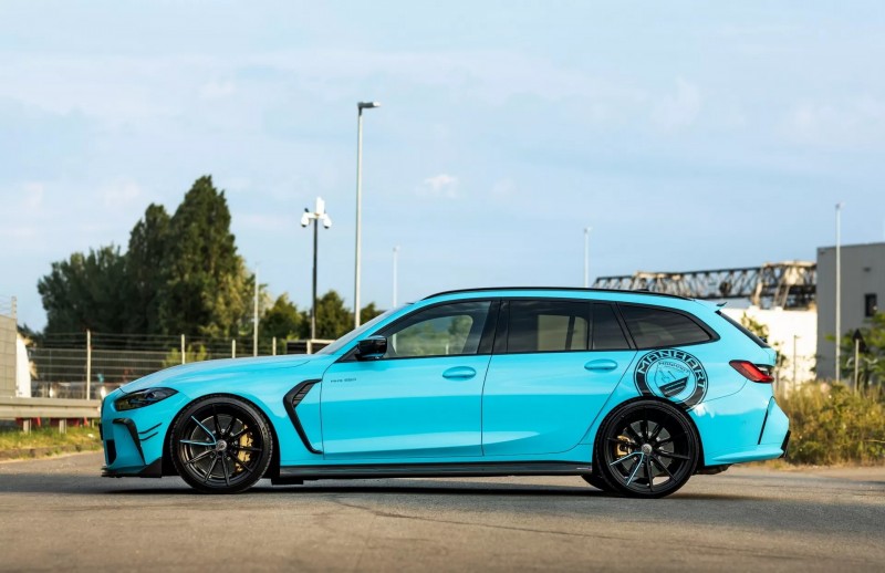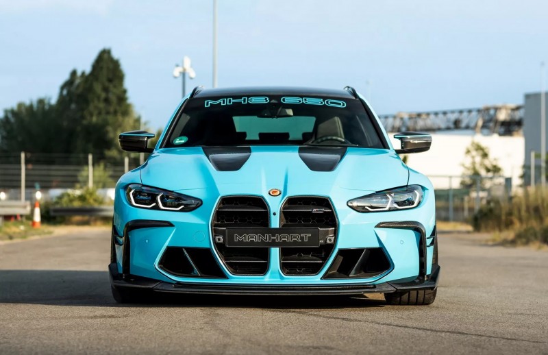 MH3 650上身之後,現在這輛M3 Touring擁有650匹最大馬力。 目前展示車輛採用了淡藍色烤漆,並且結合了大量的碳纖維空力套件,除了原本就可選配的M Carbon外觀套件之外,Manhart還為M3 Touring採用了M4 CSL的引擎蓋和前導流板、新的水箱護罩,保桿上兩側有翼片以及進氣口的裝飾,另外在側裙以及輪拱裝飾也有所不同,而且使用了Yido Performance的前20吋、後21吋輪圈,增添了更多運動性能風采。