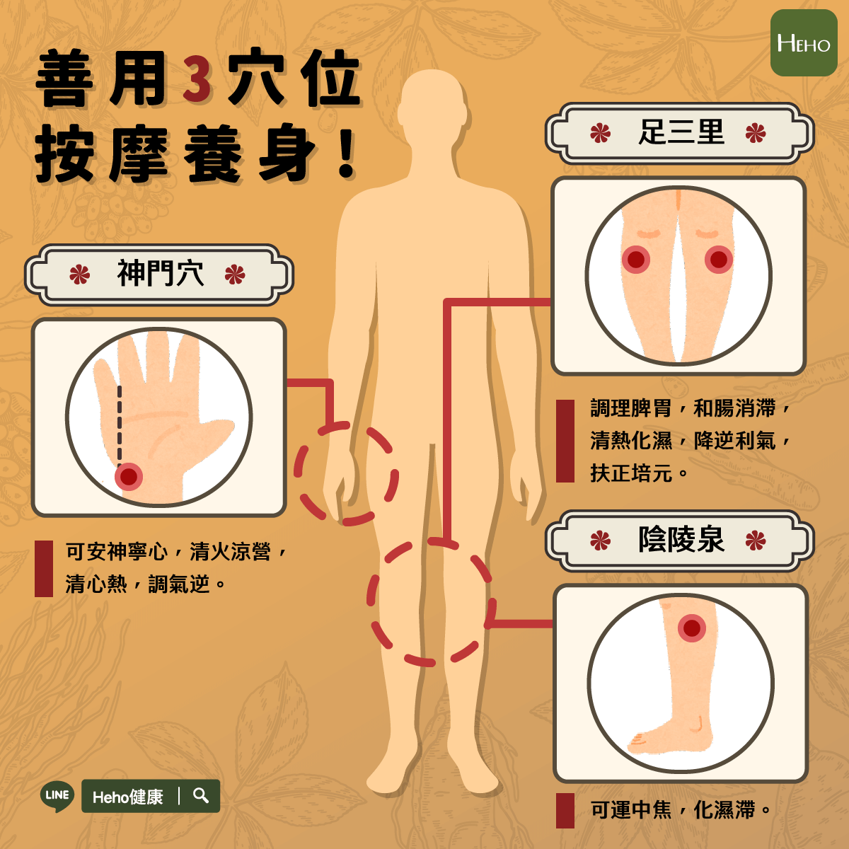 - 足三里:調理脾胃,和腸消滯,清熱化濕,降逆利氣,扶正培元。