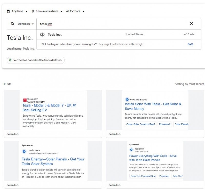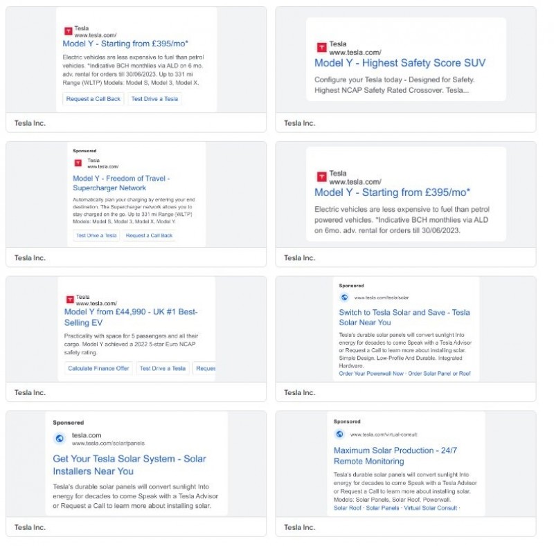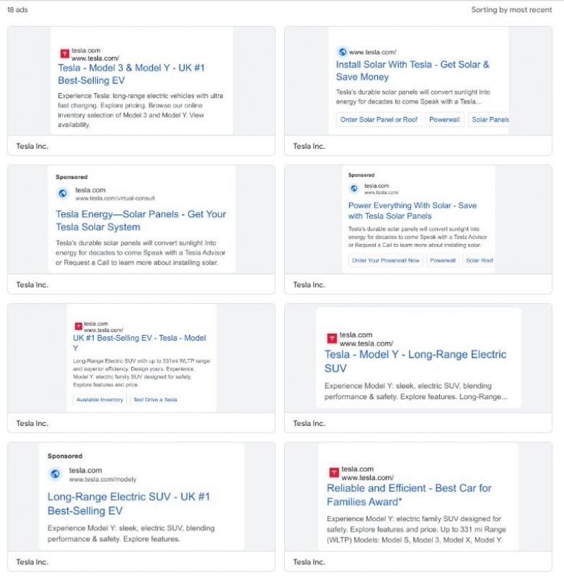 特斯拉近日開始進行廣告宣傳,在許多地方都可以看到他們的品牌短片。 你可能會以為法拉利、藍寶堅尼、勞斯萊斯這些昂貴的品牌沒有投放廣告,但其實可能只是你並非他們的目標客戶,因此廣告沒有觸及到你的範圍,而其實一直沒有投放廣告的是電動車龍頭品牌特斯拉,但現在我們都熟知的電動車品牌特斯拉開始投放廣告了,今年5月在德州舉辦的股東大會上,執行長Elon Musk公開表示未來將會嘗試一些廣告,來看看效果怎麼樣,而近日有網友發現特斯拉在Google上投放了18個廣告,其中不只是熱銷的Model 3以及Model Y,他們還宣傳自家太陽能電池以及超充網絡系統。