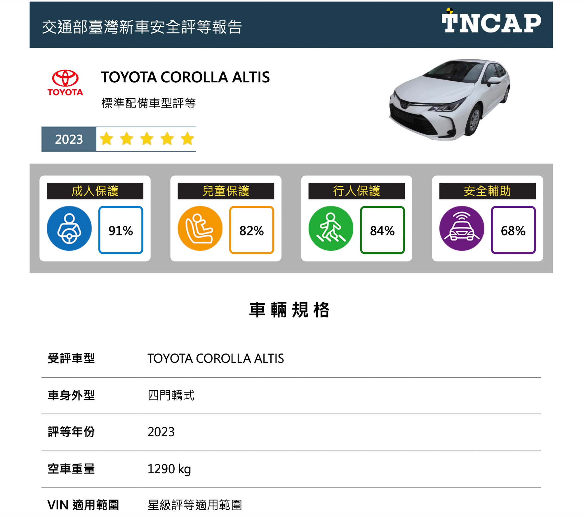 一、Toyota Corolla Altis 於四大安全領域得分率中分別獲得成人保護 91%、兒童保護 82%、行人保護 84%及安全輔助 68%,依據星級評等平衡標準規定,Corolla Altis 車型整體星級評等為五顆星。