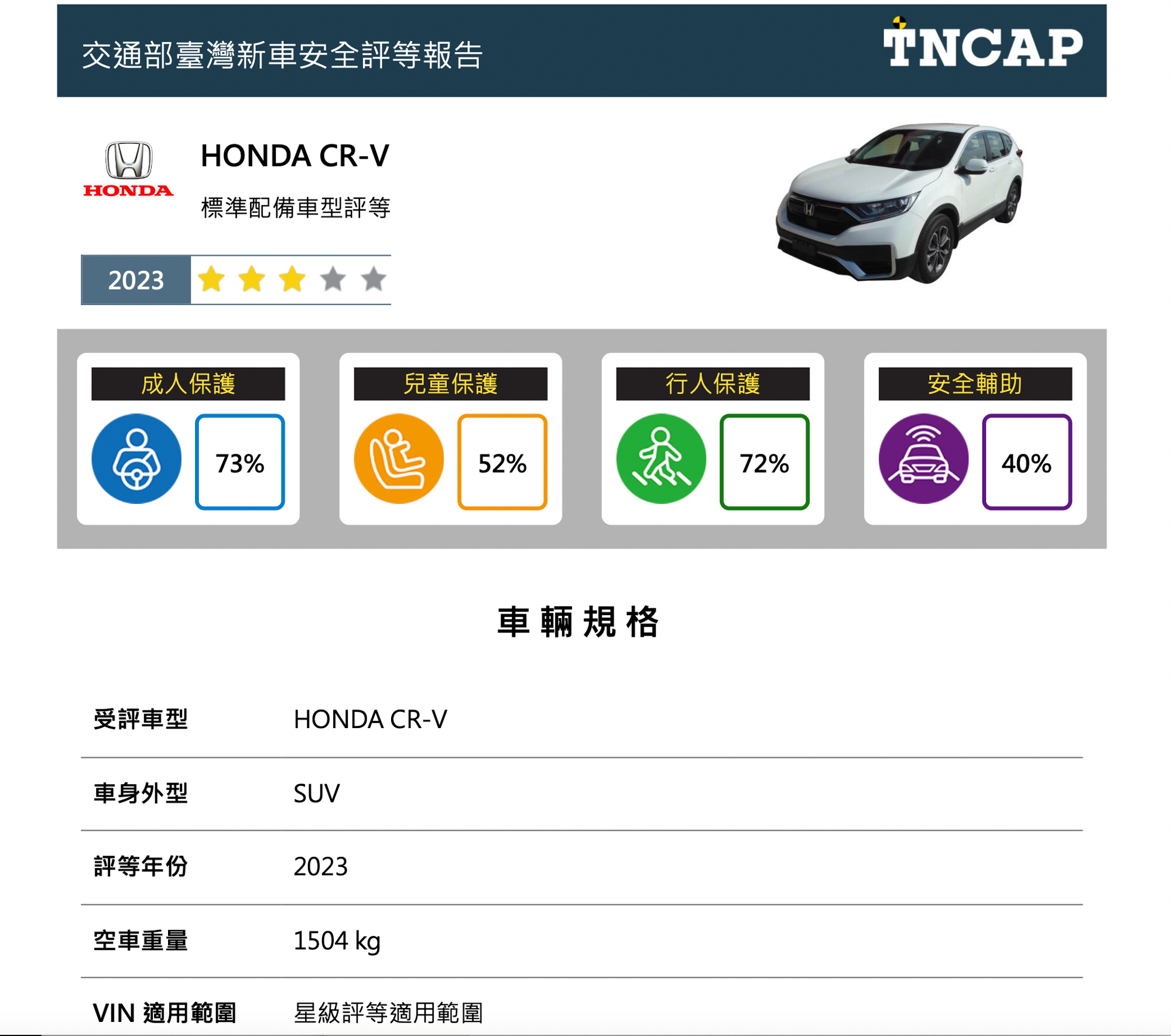 二、Honda CR-V 於四大安全領域得分率中分別獲得成人保護 73%、兒童保護 52%、行人保護 72% 及安全輔助 40%,依據星級評等平衡標準規定,CR-V 車型整體星級評等為三顆星。