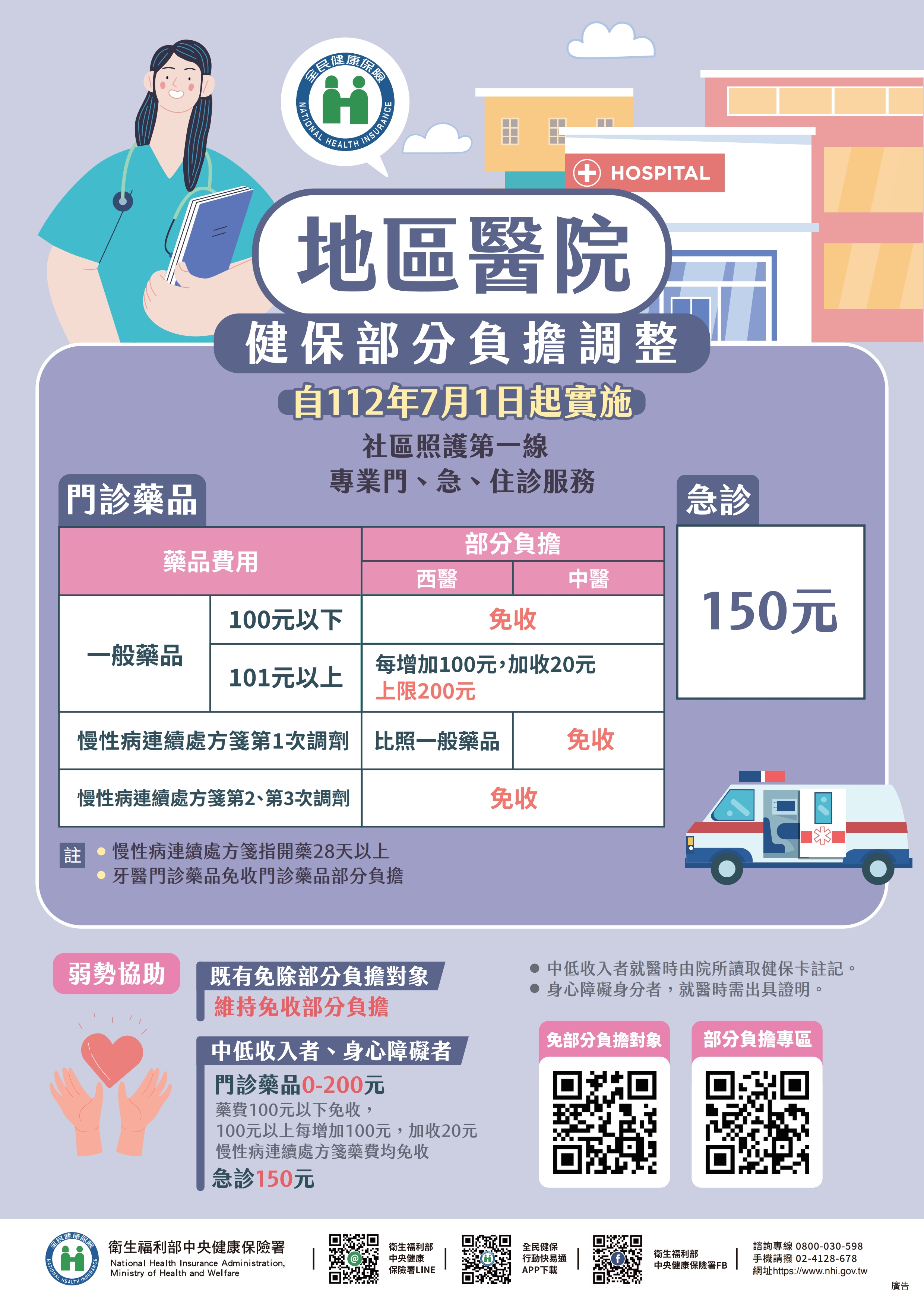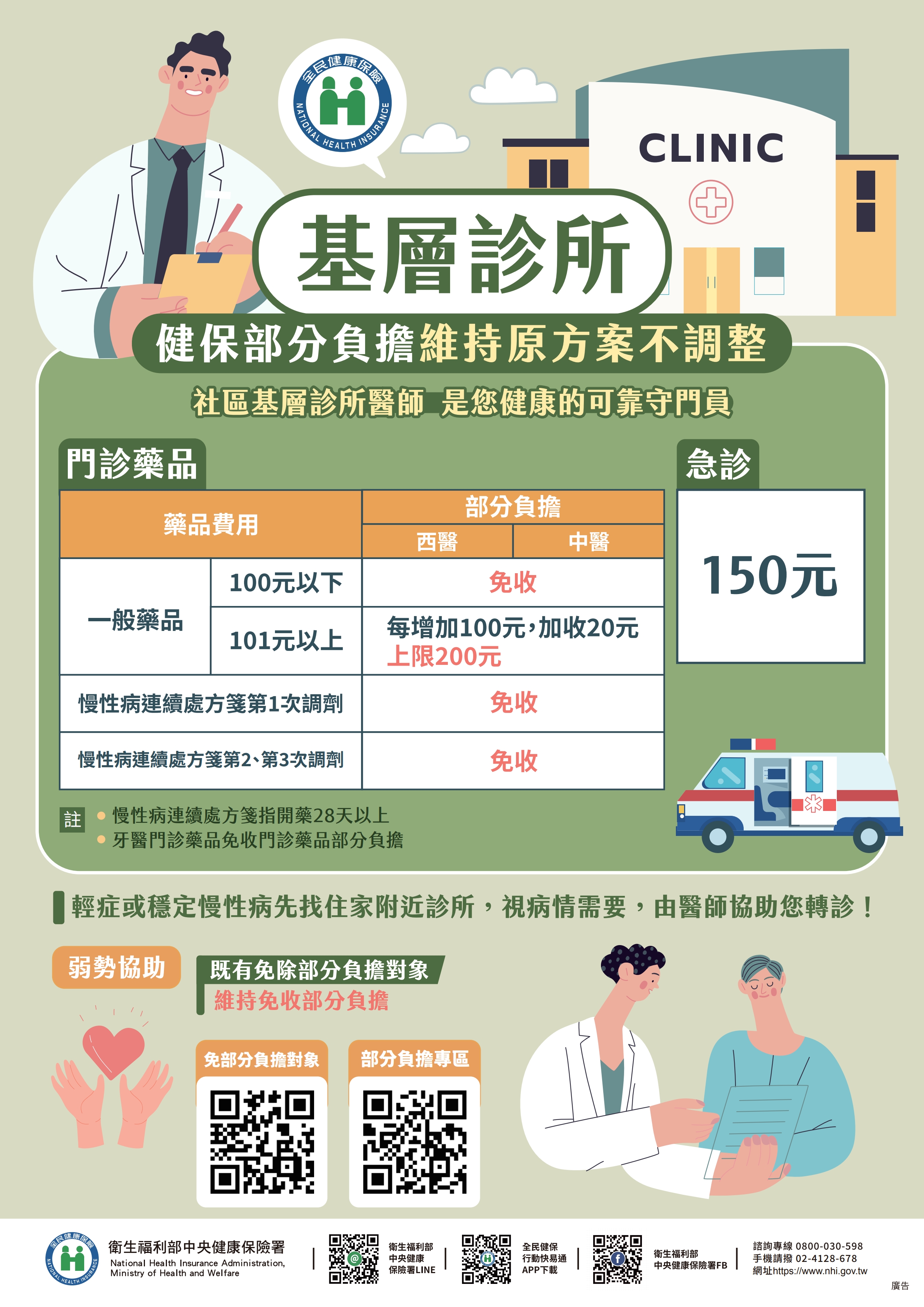 - 基層診所、地區醫院:維持原本收費150元。