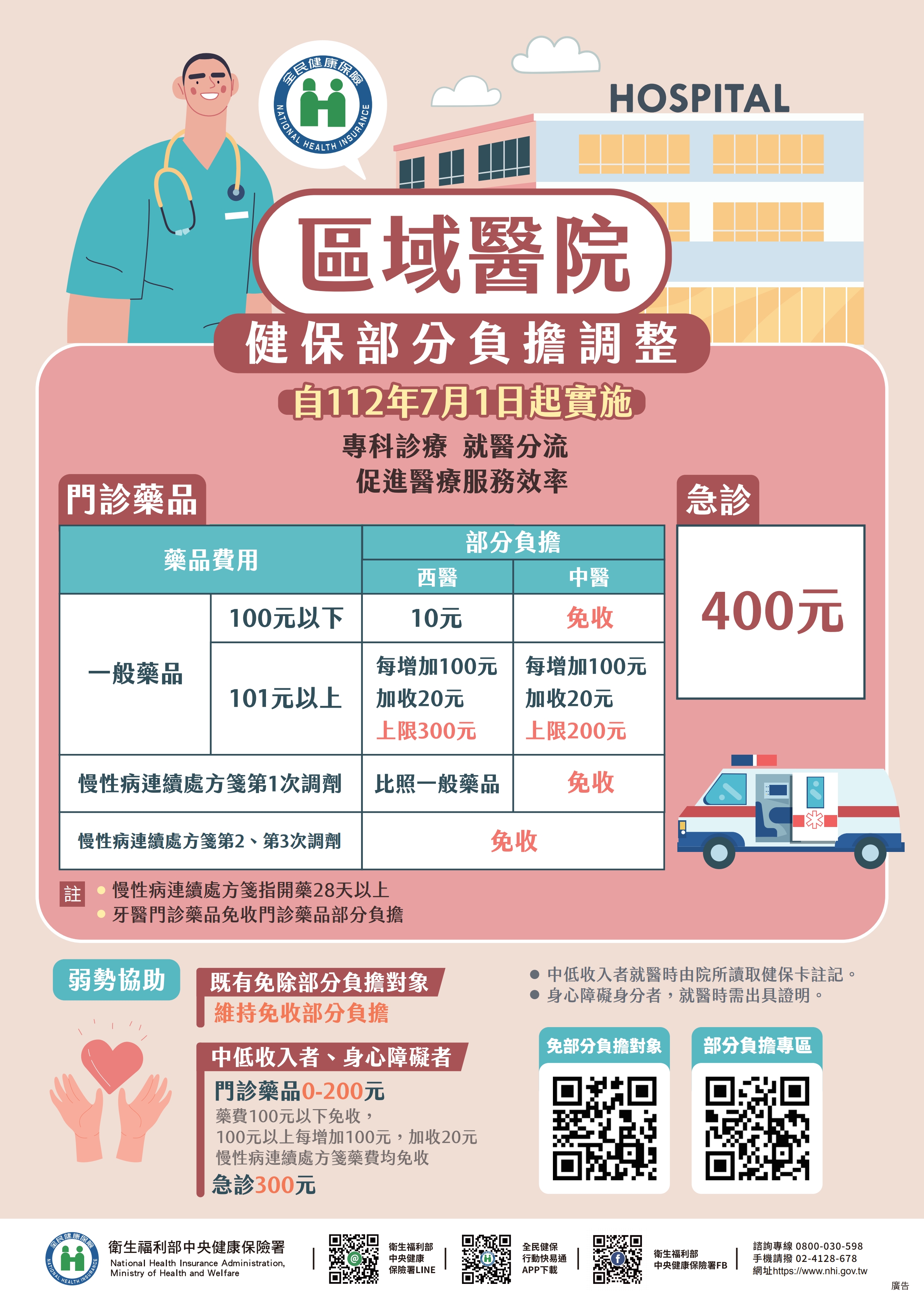 - 區域醫院:原本收費300元,調整為收400元。
