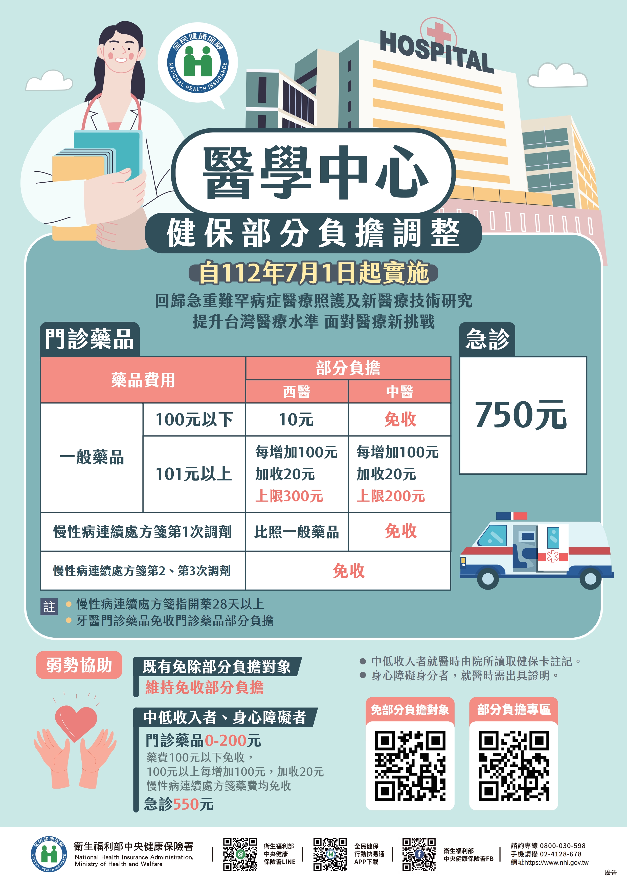 民眾想知道更多部分負擔相關資訊,可瀏覽健保署全球資訊網的「部分負擔」專區,或撥打健保署諮詢專線︰0800-030-598,手機請改撥02-4128-678洽詢。