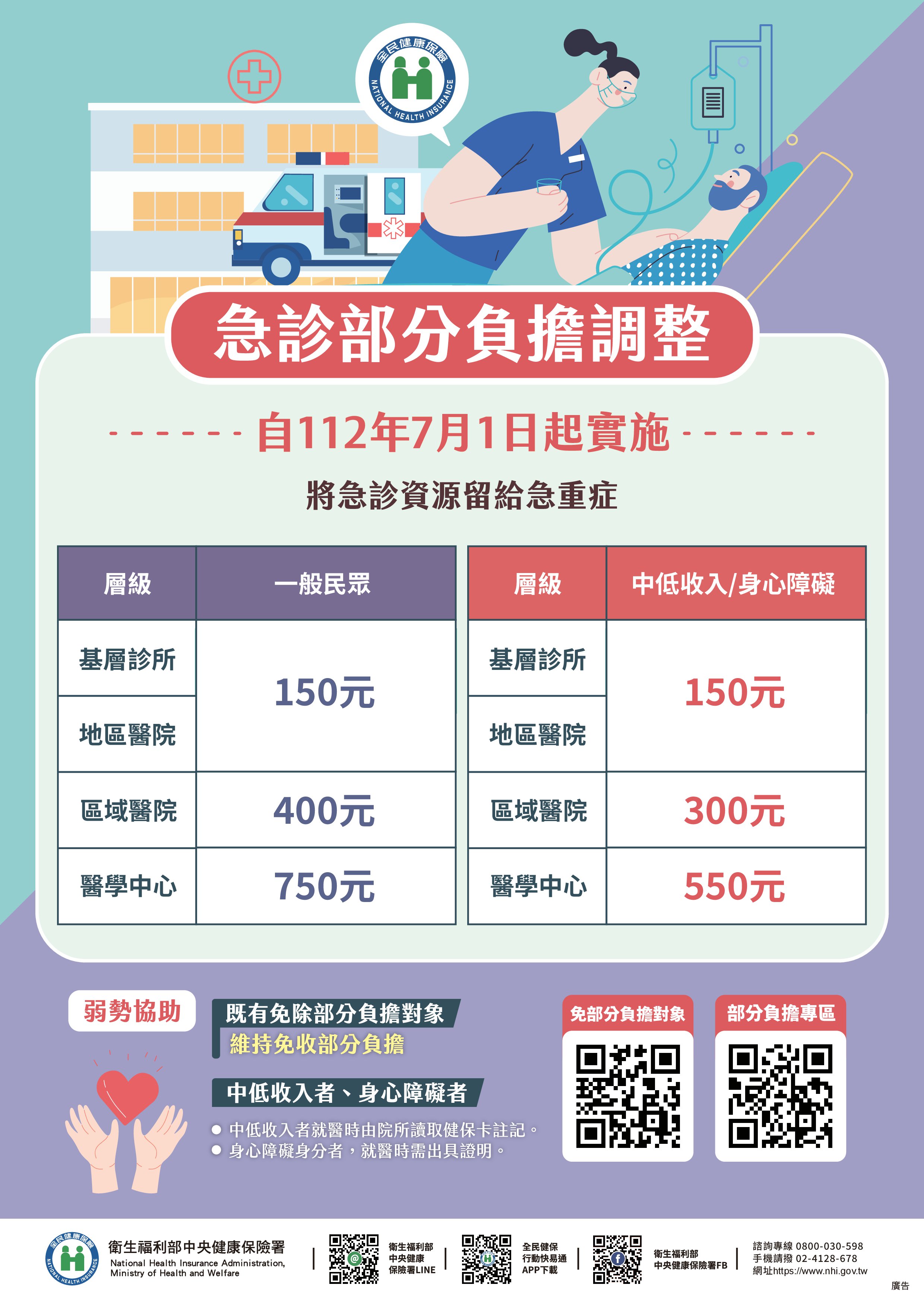- 低收入戶、中低收入者、身心障礙者:基層診所、地區醫院維持原本收費150元,區域醫院維持原本收費300元;醫學中心則統一調整為收550元。