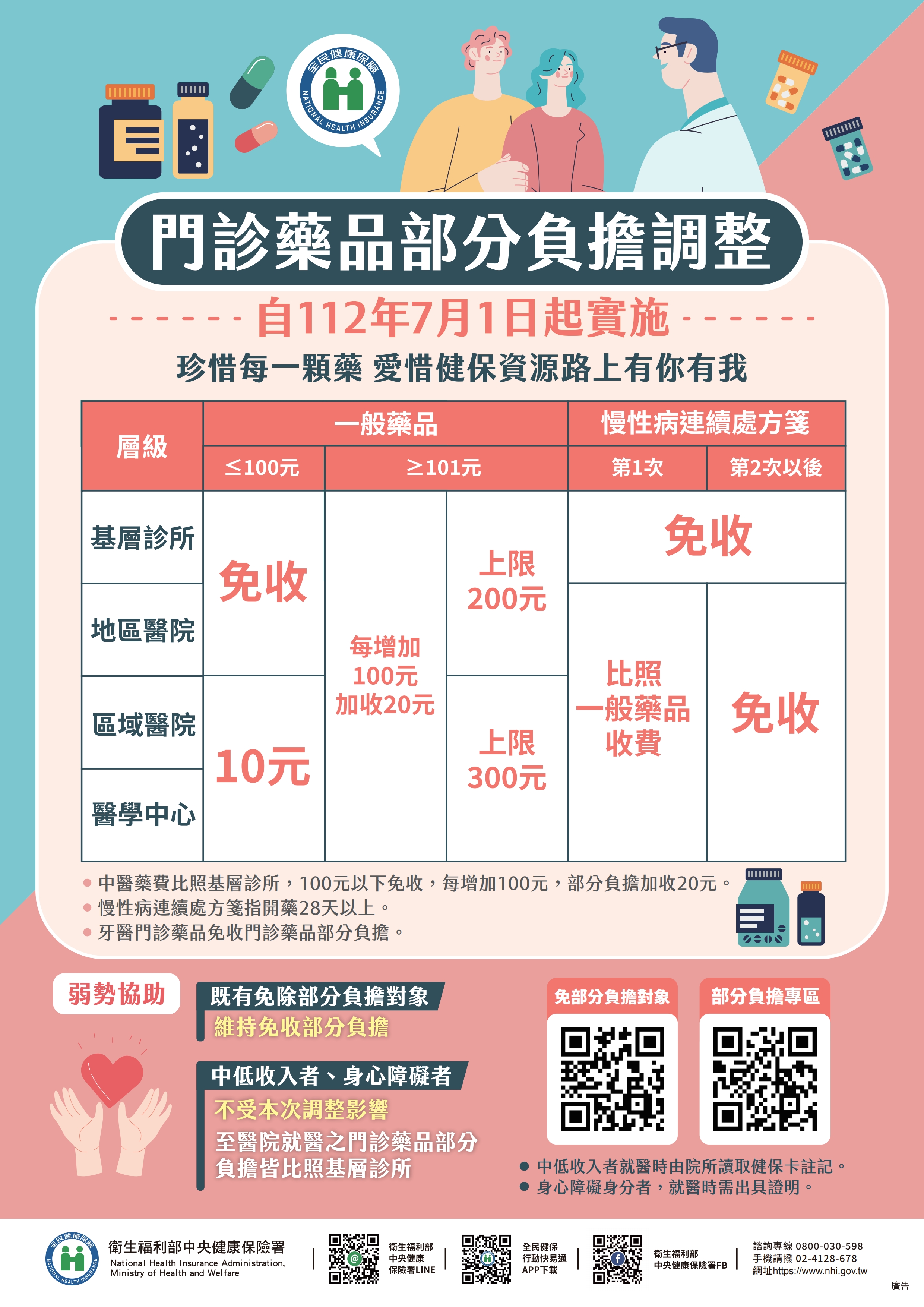 - 低收入戶、中低收入者、身心障礙者:不論就醫醫院層級別,均維持藥費100元以下免收取費用,101元以上收取20%費用、最高收取200元。