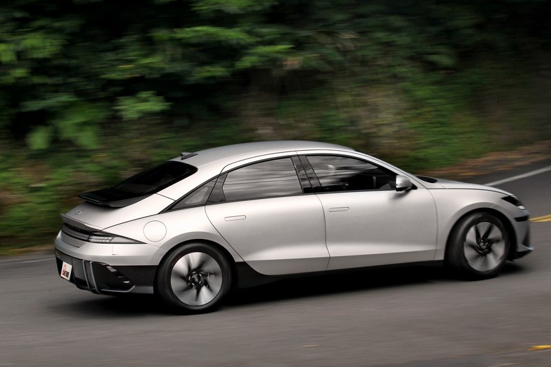 前方也有45公升置物空間。 由於Ioniq 6有著濃厚的跑格氣息,因此我們更加好奇在這扮相下究竟實際跑起來會有何表現?頗為硬朗的懸吊反應讓我們一上路就感受到Ioniq 6亟欲展現跑房身分,無論是大小坑洞或接縫都能讓車內乘員清楚了解當下路面資訊。然而這種硬朗個性於過彎轉向時並無法有效抑制側傾,不過當速度提升加快後一切反應都變了,原本低速所發生的情況在快速通過山路彎角時竟全不存在,於彎中懸吊初段仍柔韌反應,但之後隨即產生對抗側傾的明顯支撐力,而此等反應也讓駕駛能更放心的巢下個彎角前進,甚至還會有想再加快速度的想法,除此之外,行經不平處的震動回饋也變得比先前低速更柔和。