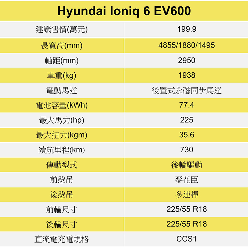 至於多數消費者關心的充電效率,Ioniq 6 EV600不僅會跑配置的77.4kWh電池,擁有730公里(NEDC)行駛里程及擁有800V直流快充系統,且支援相容350kW超高速充電樁,因此於18分鐘就能充電至80%。