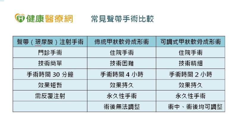 謝麗君表示,過往植入物需在手術前由醫師仔細雕琢適合大小,且植入後無法調整,恐留下「失之毫釐,差以千里」遺憾;最新的「可調式甲狀軟骨成形術」手術時間約2小時,只在頸部留有4至5公分傷口,術中可即時調整聲音,手術當天就能感到明顯改善,術後聲帶消腫後,若對聲音不滿意,還可以回門診微調到理想「美聲」,且不需特別復健、練習及保養,恢復正常生活。