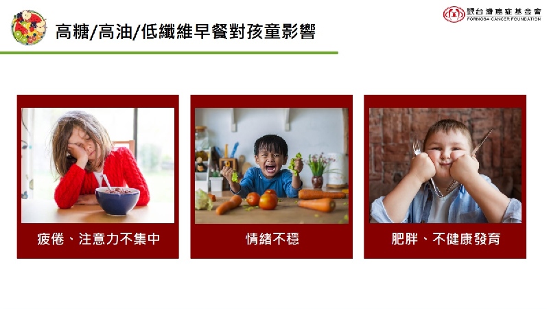 陳木榮說明,不少孩子喜愛炸雞等香噴噴的肉類,乳製品、蔬菜和水果攝入不足,診間甚至有家長以為「孩子胖嘟嘟的很可愛」。現代的早餐無論是中式或西式,大部分都是碳水化合物為主的外食早餐組合,鮮少有蔬果。若長期只吃碳水化合物、缺乏膳食纖維,不僅血糖容易快速上升,也會出現腦袋昏沉、易睏、情緒不穩等影響孩童學習表現,也會伴隨肥胖、免疫力不佳等問題。