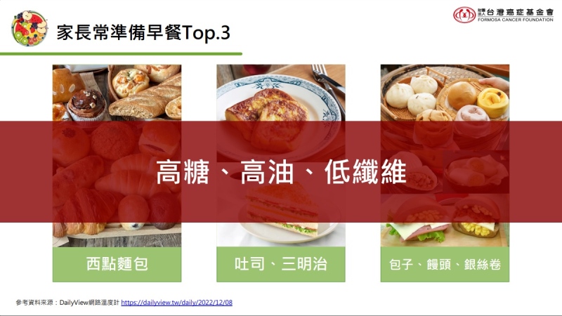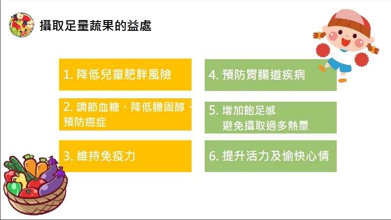 台灣癌症基金會徐桂婷營養師呼籲,家長應重視孩童養成每日「3蔬2果」的良好飲食習慣,可以從早餐加入蔬果開始。早餐加入蔬果有許多益處,除了促進消化機能幫助蛋白質消化,也可增加飽足感,避免吃進許多高熱量食物,也可穩定血糖、提升孩童活力及學習力。徐桂婷分析,其實國內學童的蔬果攝取不足沒有那麼糟糕,平均攝取蔬菜量約1.72份、水果1.55份,距3蔬2果的目標沒有很遠。近9成國小學童蔬果攝取時間僅有午餐、晚餐,早餐攝取的比相對低,所以從早餐加入蔬果,很有機會達成目標。