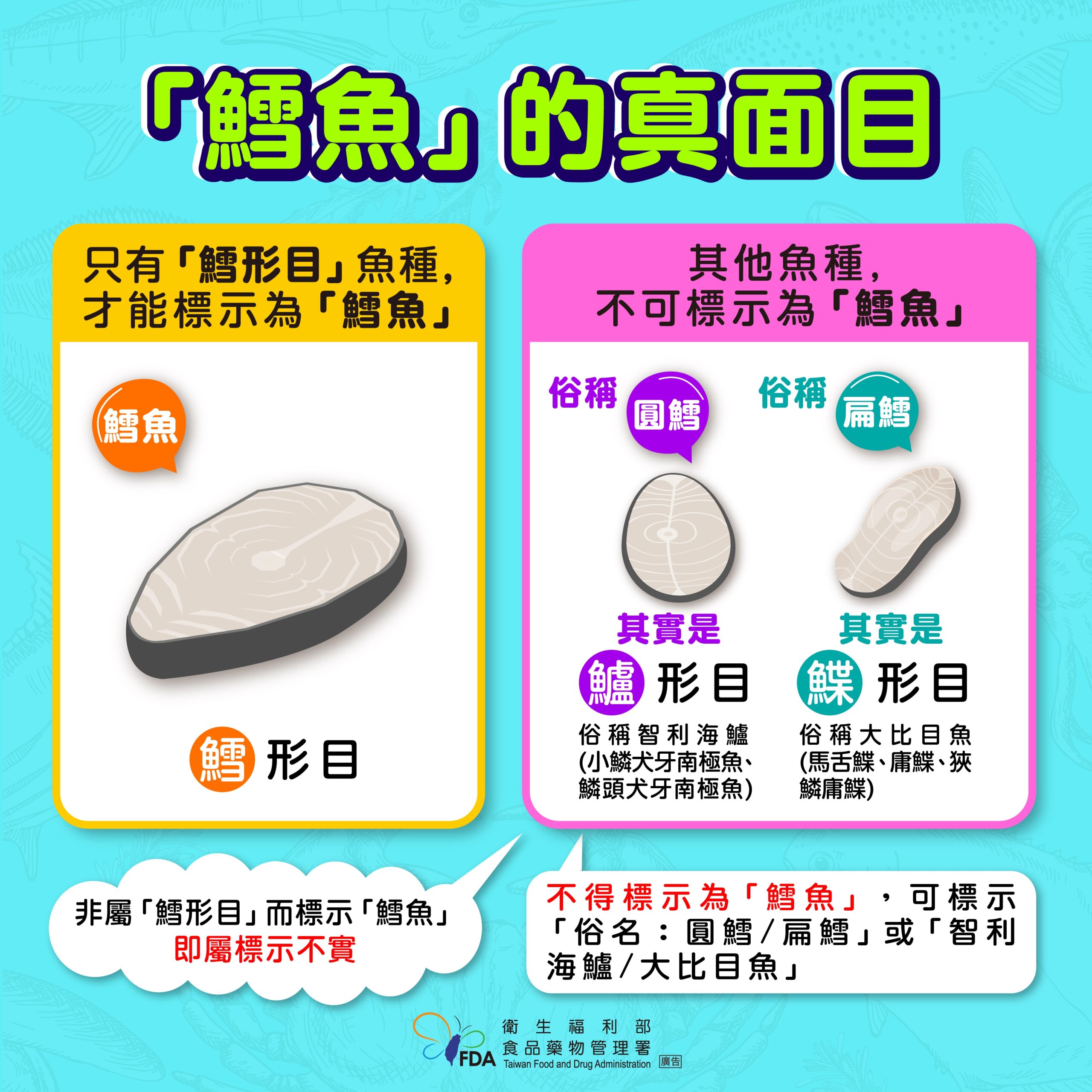 市面上的鱈魚五花八門,最常聽到的「扁鱈」和「圓鱈」兩大類,其實也都不是真的鱈魚,前者屬於「鱸形目」;後者則屬於「鰈形目」。魚體切片上外型有些差異,「扁鱈」顯然以斜切方式處理,斜切以增加魚片的面積,常見就是小塊的扁鱈就是便當或西餐的鱈魚排,而「圓鱈」顧名思義外型會比扁鱈更圓。