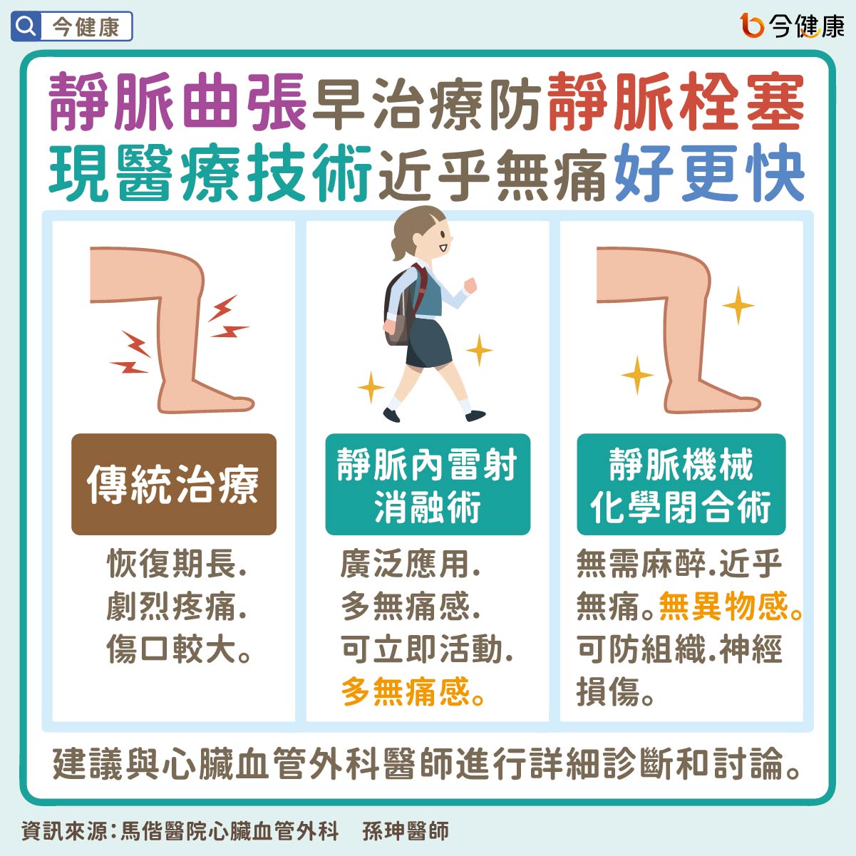 好消息是,傳統的治療方式近年已逐漸被新興的微創技術所取代,新型的手術已經可以達到不需住院、免全身麻醉、近乎無痛等成效。其中,「靜脈內雷射消融術(Endovenous Laser Treatment, EVLT)」是最被廣泛應用的微創治療之一,導入極細的雷射光纖,以精準的雷射能量,利用熱能治療靜脈曲張。通常手術都會搭配麻醉液,多數病人在術後是不會感到任何疼痛的,而且可以馬上下床自由活動,隔天即可恢復正常生活作息。